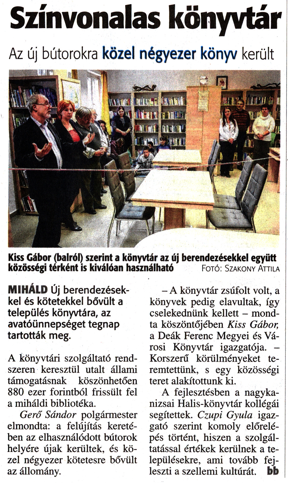 Nyilvános 2049 | 3425 | Zalai Hírlap 2017. november 15. 266. szám 4. oldal | Színvonalas könyvtár Az új bútorokra közel négyezer könyv került Kiss Gábor (balról) szerint a könyvtár az új berendezésekkel együtt közösségi térként is kiválóan használható Fotó: Szakony Attila MIHÁLD Új berendezésekkel és kötetekkel bővült a település könyvtára, az avatóünnepséget tegnap tartották meg. A könyvtári szolgáltató rendszeren keresztül utalt állami támogatásnak köszönhetően 880 ezer forintból frissült fel a miháldi bibliotéka. Gerő Sándor polgármester elmondta: a felújítás keretében az elhasználódott bútorok helyére újak kerültek, és közel négyezer kötetesre bővült az állomány. - A könyvtár zsúfolt volt, a könyvek pedig elavultak, így cselekednünk kellett - mondta köszöntőjében Kiss Gábor, a Deák Ferenc Megyei és Városi Könyvtár igazgatója. -Korszerű körülményeket teremtettünk, s egy közösségi teret alakítottunk ki. A fejlesztésben a nagykanizsai Halis-könyvtár kollégái segítettek. Czupi Gyula igazgató szerint komoly előrelépés történt, hiszen a szolgáltatással értékek kerülnek a településekre, ami tovább fejleszti a szellemi kultúrát, bb |