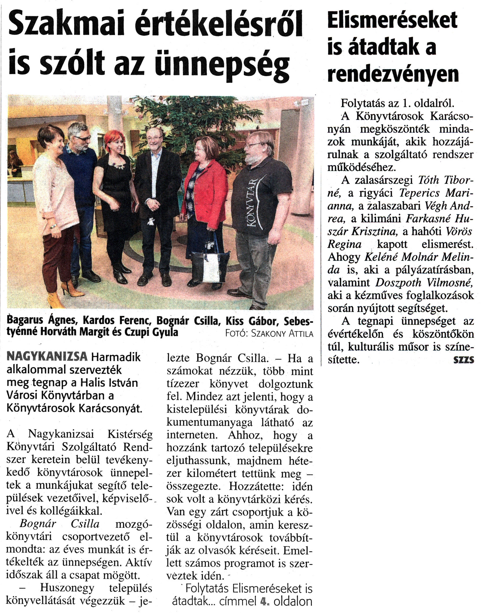 Nyilvános 2038 | 3574 | Zalai Hírlap 2017. december 13. 290. szám 1, 4. oldal | Szakmai értékelésről is szólt az ünnepség NAGYKANIZSA Harmadik alkalommal szervezték meg tegnap a Halis István Városi Könyvtárban a Könyvtárosok Karácsonyát. A Nagykanizsai Kistérség Könyvtári Szolgáltató Rendszer keretein belül tevékenykedő könyvtárosok ünnepeltek a munkájukat segítő települések vezetőivel, képviselőivel és kollégáikkal. Bognár Csilla mozgókönyvtári csoportvezető elmondta: az éves munkát is értékelték az ünnepségen. Aktív időszak áll a csapat mögött. - Huszonegy település könyvellátását végezzük - jelezte Bognár Csilla. - Ha a számokat nézzük, több mint tízezer könyvet dolgoztunk fel. Mindez azt jelenti, hogy a kistelepülési könyvtárak dokumentumanyaga látható az interneten. Ahhoz, hogy a hozzánk tartozó településekre eljuthassunk, majdnem hétezer kilométert tettünk meg - összegezte. Hozzátette: idén sok volt a könyvtárközi kérés. Van egy zárt csoportjuk a közösségi oldalon, amin keresztül a könyvtárosok továbbítják az olvasók kéréseit. Emellett számos programot is szerveztek idén. - Folytatás Elismeréseket is átadtak... címmel 4. oldalon Elismeréseket is átadtak a rendezvényen Folytatás az 1. oldalról. A Könyvtárosok Karácsonyán megköszönték mindazok munkáját, akik hozzájárulnak a szolgáltató rendszer működéséhez. A zalasárszegi Tóth Tibor-né, a rigyáci Teperics Marianna, a zalaszabari Végh Andrea, a kilimáni Farkasné Huszár Krisztina, a hahóti Vörös Regina kapott elismerést. Ahogy Keléné Molnár Melinda is, aki a pályázatírásban, valamint Doszpoth Vilmosné, aki a kézműves foglalkozások során nyújtott segítséget. A tegnapi ünnepséget az évértékelőn és köszöntőkön túl, kulturális műsor is színesítette. SZZS Bagarus Ágnes, Kardos Ferenc, Bognár Csilla, Kiss Gábor, Sebestyénné Horváth Margit és Czupi Gyula Fotó: Szakony Attila |