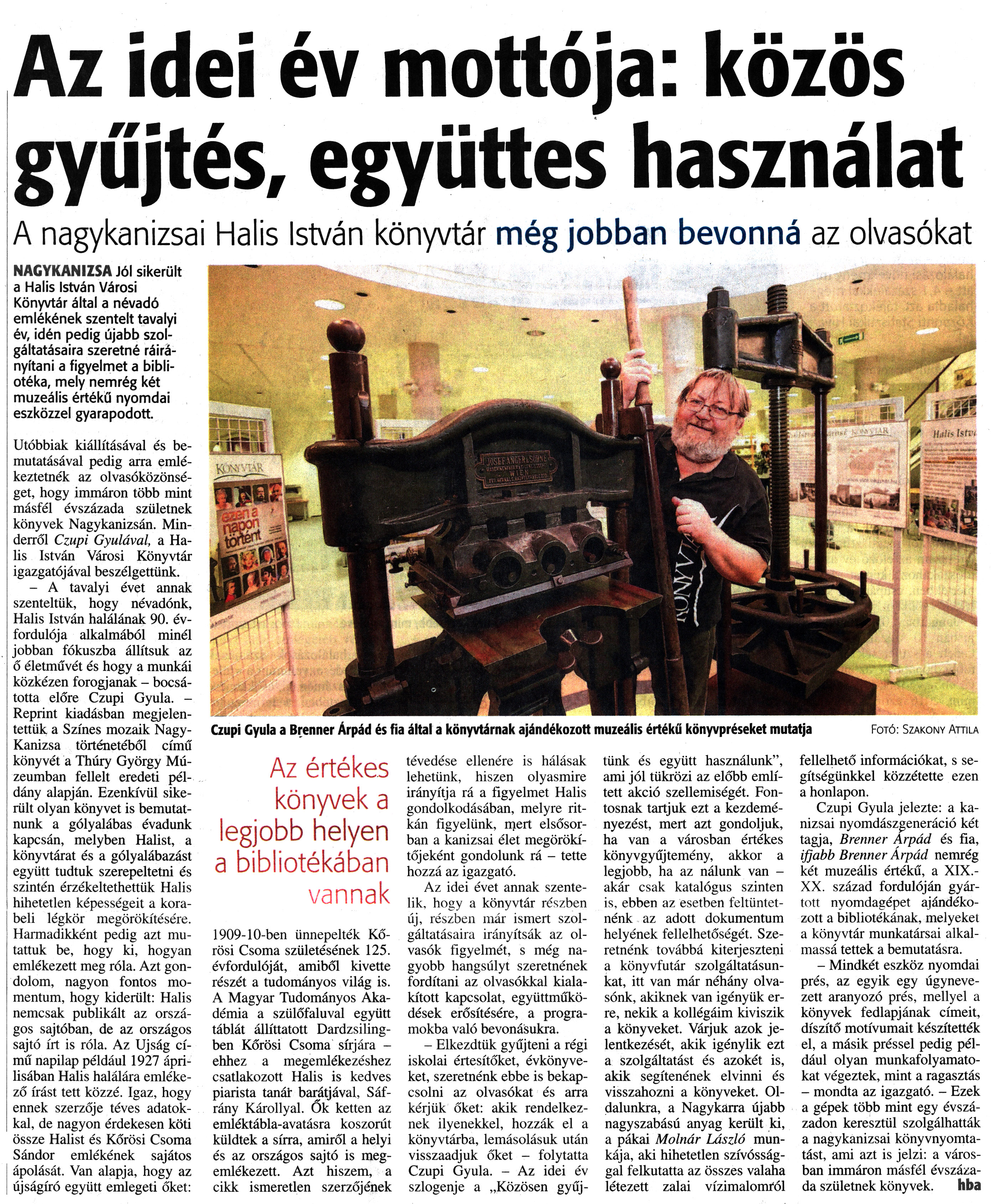 Nyilvános 2105 | 3888 | Zalai Hírlap 2018. január 29. 24. szám 6. oldal - Az idei év mottója | Az idei év mottója: közös gyűjtés, együttes használat A nagykanizsai Halis István könyvtár még jobban bevonná az olvasókat Czupi Gyula a Brenner Árpád és fia által a könyvtárnak ajándékozott muzeális értékű könyvpréseket mutatja Fotó: Szakony Attila NAGYKANIZSA Jól sikerült a Halis István Városi Könyvtár által a névadó emlékének szentelt tavalyi év, idén pedig újabb szolgáltatásaira szeretné ráirányítani a figyelmet a bibliotéka, mely nemrég két muzeális értékű nyomdai eszközzel gyarapodott. Utóbbiak kiállításával és bemutatásával pedig arra emlékeztetnék az olvasóközönséget, hogy immáron több mint másfél évszázada születnek könyvek Nagykanizsán. Minderről Czupi Gyulával, a Halis István Városi Könyvtár igazgatójával beszélgettünk. - A tavalyi évet annak szenteltük, hogy névadónk, Halis István halálának 90. évfordulója alkalmából minél jobban fókuszba állítsuk az ő életművét és hogy a munkái közkézen forogjanak - bocsátotta előre Czupi Gyula. -Reprint kiadásban megjelentettük a Színes mozaik Nagy-Kanizsa történetéből című könyvét a Thúry György Múzeumban fellelt eredeti példány alapján. Ezenkívül sikerült olyan könyvet is bemutatnunk a gólyalábas évadunk kapcsán, melyben Halist, a könyvtárat és a gólyalábazást együtt tudtuk szerepeltetni és szintén érzékeltethettük Halis hihetetlen képességeit a korabeli légkör megörökítésére. Harmadikként pedig azt mutattuk be, hogy ki, hogyan emlékezett meg róla. Azt gondolom, nagyon fontos momentum, hogy kiderült: Halis nemcsak publikált az országos sajtóban, de az országos sajtó írt is róla. Az Újság című napilap például 1927 áprilisában Halis halálára emlékező írást tett közzé. Igaz, hogy ennek szerzője téves adatokkal, de nagyon érdekesen köti össze Halist és Kőrösi Csoma Sándor emlékének sajátos ápolását. Van alapja, hogy az újságíró együtt emlegeti őket: Az értékes könyvek a legjobb helyen a bibliotékában vannak 1909-10-ben ünnepelték Kőrösi Csoma születésének 125. évfordulóját, amiből kivette részét a tudományos világ is. A Magyar Tudományos Akadémia a szülőfaluval együtt táblát állíttatott Dardzsiling-ben Kőrösi Csoma sírjára -ehhez a megemlékezéshez csatlakozott Halis is kedves piarista tanát barátjával, Sáfrány Károllyal. Ők ketten az emléktábla-avatásra koszorút küldtek a sírra, amiről a helyi és az országos sajtó is megemlékezett. Azt hiszem, a cikk ismeretlen szerzőjének tévedése ellenére is hálásak lehetünk, hiszen olyasmire irányítja rá a figyelmet Halis gondolkodásában, melyre ritkán figyelünk, mert elsősorban a kanizsai élet megörökítőjeként gondolunk rá - tette hozzá az igazgató. Az idei évet annak szentelik, hogy a könyvtár részben új, részben már ismert szolgáltatásaira irányítsák az olvasók figyelmét, s még nagyobb hangsúlyt szeretnének fordítani az olvasókkal kialakított kapcsolat, együttműködések erősítésére, a programokba való bevonásukra. - Elkezdtük gyűjteni a régi iskolai értesítőket, évkönyveket, szeretnénk ebbe is bekapcsolni az olvasókat és arra kérjük őket: akik rendelkeznek ilyenekkel, hozzák el a könyvtárba, lemásolásuk után visszaadjuk őket - folytatta Czupi Gyula. - Az idei év szlogenje a „Közösen gyűjtünk és együtt használunk", ami jól tükrözi az előbb említett akció szellemiségét. Fontosnak tartjuk ezt a kezdeményezést, mert azt gondoljuk, ha van a városban értékes könyvgyűjtemény, akkor a legjobb, ha az nálunk van -akár csak katalógus szinten is, ebben az esetben feltüntetnénk az adott dokumentum helyének fellelhetőségét. Szeretnénk továbbá kiterjeszteni a könyvfutár szolgáltatásunkat, itt van már néhány olvasónk, akiknek van igényük erre, nekik a kollégáim kiviszik a könyveket. Várjuk azok jelentkezését, akik igénylik ezt a szolgáltatást és azokét is, akik segítenének elvinni és visszahozni a könyveket. Oldalunkra, a Nagykarra újabb nagyszabású anyag került ki, a pákai Molnár László munkája, aki hihetetlen szívóssággal felkutatta az összes valaha létezett zalai vízimalomról fellelhető információkat, s segítségünkkel közzétette ezen a honlapon. Czupi Gyula jelezte: a kanizsai nyomdászgeneráció két tagja, Brenner Árpád és fia, ifjabb Brenner Árpád nemrég két muzeális értékű, a XIX.-XX. század fordulóján gyártott nyomdagépet ajándékozott a bibliotékának, melyeket a könyvtár munkatársai alkalmassá tettek a bemutatásra. - Mindkét eszköz nyomdai prés, az egyik egy úgynevezett aranyozó prés, mellyel a könyvek fedlapjának címeit, díszítő motívumait készítették el, a másik préssel pedig például olyan munkafolyamatokat végeztek, mint a ragasztás - mondta az igazgató. - Ezek a gépek több mint egy évszázadon keresztül szolgálhatták a nagykanizsai könyvnyomtatást, ami azt is jelzi: a városban immáron másfél évszázada születnek könyvek. hba |