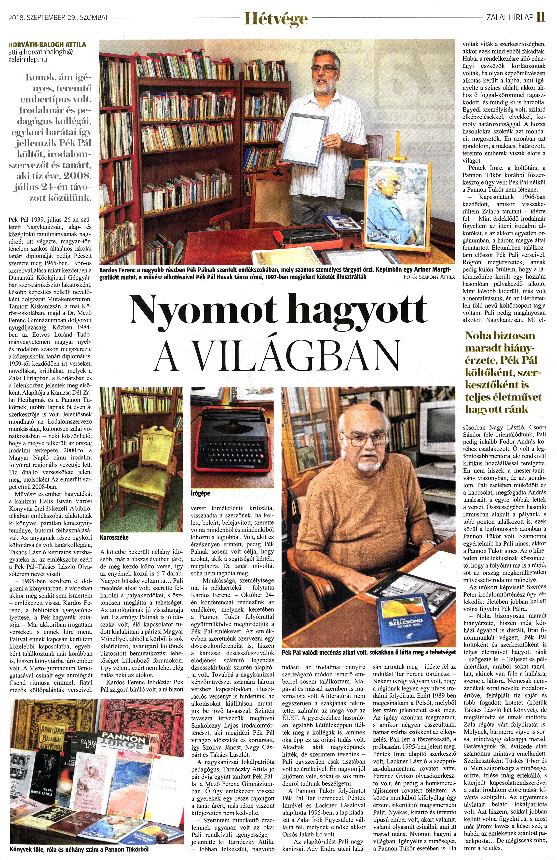 Nyilvános 1730 | 3536 | Zalai Hírlap 2018. szeptember 29. 227. szám 11. oldal - Nyomot hagyott a világban | HORVÁTH-BALOGH ATTILA attila.horvathbalogh@ zalaihirlap.hu Konok, ám igényes, teremtő embertípus volt. Irodalmár és pedagógus kollégái, egykori barátai így jellemzik Pék Pál költőt, irodalomszervezőt és tanárt, aki tíz éve, 2008. július 21 -én távozott közülünk. Pék Pál 1939. július 26-án született Nagykanizsán, alap- és középfokú tanulmányainak nagy részét ott végezte, magyar-történelem szakos általános iskolai tanári diplomáját pedig Pécsett szerezte meg 1965-ben. 1956-os szerepvállalása miatt kezdetben a Dunántúli Kőolajipari Gépgyárban szerszámkészítő lakatosként, később képesítés nélküli nevelőként dolgozott Murakeresztúron. Tanított Kiskanizsán, a mai Kőrösi-iskolában, majd a Dr. Mező Ferenc Gimnáziumban dolgozott nyugdíjazásáig. Közben 1984-ben az Eötvös Loránd Tudományegyetemen magyar nyelv és irodalom szakon megszerezte a középiskolai tanári diplomát is. 1959-től kezdődően írt verseket, novellákat, kritikákat, melyek a Zalai Hírlapban, a Kortársban és a Jelenkorban jelentek meg elsőként. Alapítója a Kanizsa Dél-Zalai Hetilapnak és a Pannon Tükörnek, utóbbi lapnak öt éven át szerkesztője is volt. Jelentősnek mondható az irodalomszervező munkássága, különösen zalai vonatkozásban - neki köszönhető, hogy a megye felkerült az ország irodalmi térképére. 2000-től a Magyar Napló című irodalmi folyóirat regionális vezetője lett. Tíz önálló verseskötete jelent meg, utolsóként Az elmerült sziget című 2008-ban. Művészi és emberi hagyatékát a kanizsai Halis István Városi Könyvtár őrzi és kezeli. A bibliotékában emlékszobát alakítottak ki könyvei, páratlan lemezgyűjteménye, bútorai felhasználásával. Az anyagnak része egykori költőtársa és volt tanárkollégája, Takács László kéziratos vershagyatéka is, az emlékszoba ezért a Pék Pál-Takács László Olvasóterem nevet viseli. - 1985-ben kezdtem el dolgozni a könyvtárban, a városban akkor még senkit sem ismertem - emlékezett vissza Kardos Ferenc, a bibliotéka igazgatóhelyettese, a Pék-hagyaték kutatója. - Már akkoriban írogattam verseket, s ennek híre ment. Palival ennek kapcsán kerültem közelebbi kapcsolatba, egyébként találkoztunk már korábban is, hiszen könyvtárba járó ember volt. A Mező-gimnázium támogatásával csinált egy antológiát Csend ritmusa címmel, fiatal mezős költőpalánták verseivel. Karosszéke A kötetbe bekerült néhány idősebb, már a húszas éveiben járó, de még kezdő költő verse, így az enyémek közül is 6-7 darab. Nagyon büszke voltam rá... Pali mecénás alkat volt, szerette felkarolni a pályakezdőket, s ösztönösen meglátta a tehetséget. Az antológiának jó visszhangja lett. Ez amúgy Palinak is jó időszaka volt, élő kapcsolatot tudott kialakítani a párizsi Magyar Műhellyel, abból a körből is sok kísérletező, avantgárd költőnek biztosított bemutatkozási lehetőséget különböző fórumokon. Úgy vélem, ezért nem lehet elég hálás neki az utókor. Kardos Ferenc felidézte: Pék Pál szigorú bíráló volt, a rá bízott verset kíméletlenül kritizálta, visszaadta a szerzőnek, ha kellett, beleírt, belejavított, szerette volna mindenből és mindenkiből kihozni a legjobbat. Volt, akit ez érzékenyen érintett, pedig Pék Pálnak sosem volt célja, hogy azokat, akik a segítségét kérték, megalázza. De tanári mivoltát soha nem tagadta meg. - Munkássága, személyisége ma is példaértékű - folytatta Kardos Ferenc. - Október 24-én konferenciát rendezünk az emlékére, melynek keretében a Pannon Tükör folyóirattal együttműködve meghirdetjük a Pék Pál-emlékévet. Az emlékévben szeretnénk szervezni egy dzsesszkonferenciát is, hiszen a kanizsai dzsesszfesztiválok elődjének számító legendás dzsesszklubnak szintén alapítója volt. Továbbá a nagykanizsai képzőművészet számára három vershez kapcsolódóan illusztrációs versenyt is hirdetünk, az alkotásokat kiállításon mutatjuk be jövő tavasszal. Szintén tavaszra tervezzük meghívni Szakolczay Lajos irodalomtörténészt, aki megidézi Pék Pál virágzó időszakát és kortársait, így Szoliva Jánost, Nagy Gáspárt és Takács Lászlót. A nagykanizsai lokálpatrióta pedagógus, Tarnóczky Attila jó pár évig együtt tanított Pék Pállal a Mező Ferenc Gimnáziumban. Ő úgy emlékezett vissza: a gyerekek egy része rajongott a tanár úrért, más része viszont kifejezetten nem kedvelte. - Szerintem mindkettő érzelemnek ugyanaz volt az oka: Pali rendkívüli igényessége, - jelentette ki Tarnóczky Attila. - Jobban felkészült, nagyobb tudású, az irodalmat ennyire szerteágazó módon ismerő emberrel sosem találkoztam. Magával és mással szemben is maximalista volt. A literatúrát nem egyszerűen a szakjának tekintette, számára az maga volt az ÉLET. A gyerekekhez hasonlóan legalább kétféleképpen ítélték meg a kollégák is, aminek oka épp ez az óriási tudás volt. Akadtak, akik nagyképűnek hitték, de szerintem tévedtek -Pali egyszerűen csak tisztában volt az értékeivel. Én nagyon jól kijöttem vele, sokat és sok mindenről tudtunk beszélgetni. A Pannon Tükör folyóiratot Pék Pál Tar Ferenccel, Péntek Imrével és Lackner Lászlóval alapította 1995-ben, a lap kiadását a Zalai írók Egyesülete vállalta fel, melynek elnöke akkor Orsós Jakab író volt. - Az alapító-ülést Pali nagykanizsai, Ady Endre utcai laká- sán tartottuk meg - idézte fel az indulást Tar Ferenc történész. -Nekem is régi vágyam volt, hogy a régiónak legyen egy nívós irodalmi folyóirata. Ezért 1989-ben megcsináltam a Pelsót, melyből két szám jelenhetett csak meg. Az igény azonban megmaradt, s 