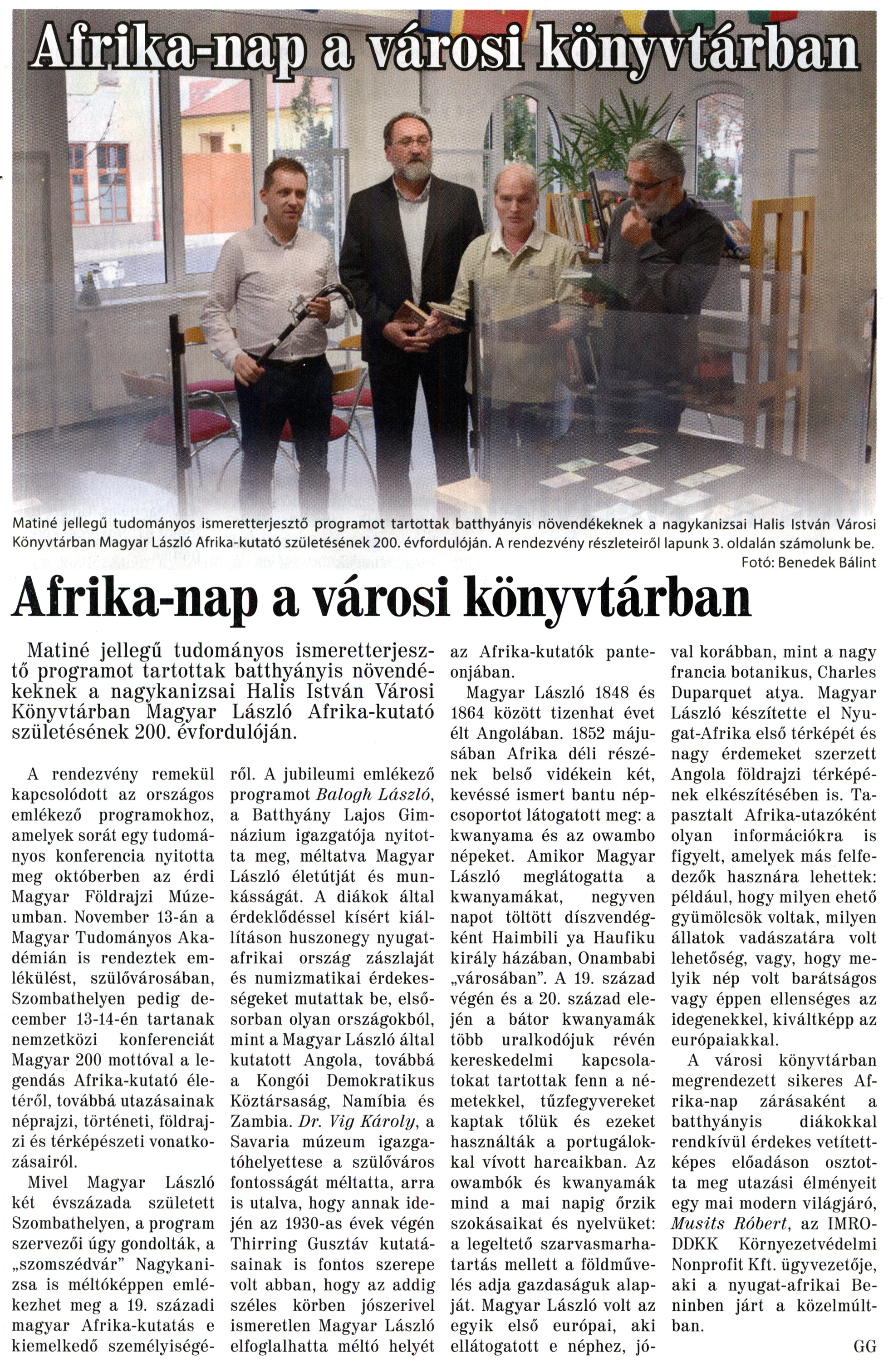 Nyilvános 2021 | 3179 | Nagykanizsai Maraton 2018. november 16. 45. szám 1, 3. oldal | Matiné jellegű tudományos ismeretterjesztő programot tartottak batthyányis növendékeknek a nagykanizsai Halis István Városi Könyvtárban Magyar László Afrika-kutató születésének 200. évfordulóján. A rendezvény részleteiről lapunk 3. oldalán számolunk be. Fotó: Benedek Bálint Afrika-nap a városi könyvtárban Matiné jellegű tudományos ismeretterjesztő programot tartottak batthyányis növendékeknek a nagykanizsai Halis István Városi Könyvtárban Magyar László Afrika-kutató születésének 200. évfordulóján. A rendezvény remekül kapcsolódott az országos emlékező programokhoz, amelyek sorát egy tudományos konferencia nyitotta meg októberben az érdi Magyar Földrajzi Múzeumban. November 13-án a Magyar Tudományos Akadémián is rendeztek emlékülést, szülővárosában, Szombathelyen pedig december 13-14-én tartanak nemzetközi konferenciát Magyar 200 mottóval a legendás Afrika-kutató életéről, továbbá utazásainak néprajzi, történeti, földrajzi és térképészeti vonatkozásairól. Mivel Magyar László két évszázada született Szombathelyen, a program szervezői úgy gondolták, a „szomszédvár" Nagykanizsa is méltóképpen emlékezhet meg a 19. századi magyar Afrika-kutatás e kiemelkedő személyiségéről. A jubileumi emlékező programot Balogh László, a Batthyány Lajos Gimnázium igazgatója nyitotta meg, méltatva Magyar László életútját és munkásságát. A diákok által érdeklődéssel kísért kiállításon huszonegy nyugatafrikai ország zászlaját és numizmatikai érdekességeket mutattak be, elsősorban olyan országokból, mint a Magyar László által kutatott Angola, továbbá a Kongói Demokratikus Köztársaság, Namíbia és Zambia. Dr. Víg Károly, a Savaria múzeum igazgatóhelyettese a szülőváros fontosságát méltatta, arra is utalva, hogy annak idején az 1930-as évek végén Thirring Gusztáv kutatásainak is fontos szerepe volt abban, hogy az addig széles körben jószerivel ismeretlen Magyar László elfoglalhatta méltó helyét az Afrika-kutatók panteonjában. Magyar László 1848 és 1864 között tizenhat évet élt Angolában. 1852 májusában Afrika déli részének belső vidékein két, kevéssé ismert bantu népcsoportot látogatott meg: a kwanyama és az owambo népeket. Amikor Magyar László meglátogatta a kwanyamákat, negyven napot töltött díszvendégként Haimbili ya Haufiku király házában, Onambabi „városában". A 19. század végén és a 20. század elején a bátor kwanyamák több uralkodójuk révén kereskedelmi kapcsolatokat tartottak fenn a németekkel, tűzfegyvereket kaptak tőlük és ezeket használták a portugálokkal vívott harcaikban. Az owambók és kwanyamák mind a mai napig őrzik szokásaikat és nyelvüket: a legeltető szarvasmarhatartás mellett a földművelés adja gazdaságuk alapját. Magyar László volt az egyik első európai, aki ellátogatott e néphez, jó- val korábban, mint a nagy francia botanikus, Charles Duparquet atya. Magyar László készítette el Nyugat-Afrika első térképét és nagy érdemeket szerzett Angola földrajzi térképének elkészítésében is. Tapasztalt Afrika-utazóként olyan információkra is figyelt, amelyek más felfedezők hasznára lehettek: például, hogy milyen ehető gyümölcsök voltak, milyen állatok vadászatára volt lehetőség, vagy, hogy melyik nép volt barátságos vagy éppen ellenséges az idegenekkel, kiváltképp az európaiakkal. A városi könyvtárban megrendezett sikeres Afrika-nap zárásaként a batthyányis diákokkal rendkívül érdekes vetítettképes előadáson osztotta meg utazási élményeit egy mai modern világjáró, Musits Róbert, az IMRO-DDKK Környezetvédelmi Nonprofit Kft. ügyvezetője, aki a nyugat-afrikai Beninben járt a közelmúltban. GG |