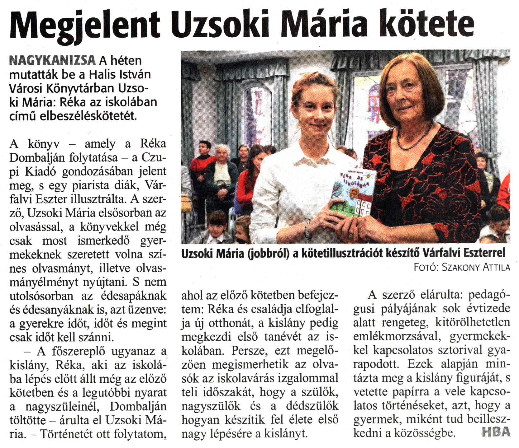 Nyilvános 1535 | 2711 | Zalai Hírlap 2018. december 20. 295. szám 6. oldal | Megjelent Uzsoki Mária kötete NAGYKANIZSA A héten mutatták be a Halis István Városi Könyvtárban Uzsoki Mária: Réka az iskolában című elbeszéléskötetét. A könyv - amely a Réka Dombalján folytatása - a Czupi Kiadó gondozásában jelent meg, s egy piarista diák, Várfalvi Eszter illusztrálta. A szerző, Uzsoki Mária elsősorban az olvasással, a könyvekkel még csak most ismerkedő gyermekeknek szeretett volna színes olvasmányt, illetve olvasmányélményt nyújtani. S nem utolsósorban az édesapáknak és édesanyáknak is, azt üzenve: a gyerekre időt, időt és megint csak időt kell szánni. - A főszereplő ugyanaz a kislány, Réka, aki az iskolába lépés előtt állt még az előző kötetben és a legutóbbi nyarat a nagyszüleinél, Dombalján töltötte - árulta el Uzsoki Mária. - Történetét ott folytatom, ahol az előző kötetben befejeztem: Réka és családja elfoglalja új otthonát, a kislány pedig megkezdi első tanévét az iskolában. Persze, ezt megelőzően megismerhetik az olvasók az iskolavárás izgalommal teli időszakát, hogy a szülők, nagyszülők és a dédszülők hogyan készítik fel élete első nagy lépésére a kislányt. A szerző elárulta: pedagógusi pályájának sok évtizede alatt rengeteg, kitörölhetetlen emlékmorzsával, gyermekekkel kapcsolatos sztorival gyarapodott. Ezek alapján mintázta meg a kislány figuráját, s vetette papírra a vele kapcsolatos történéseket, azt, hogy a gyermek, miként tud beilleszkedni a közösségbe. HBA Uzsoki Mária (jobbról) a kötetillusztrációt készítő Várfalvi Eszterrel Fotó: Szakony Attila |
