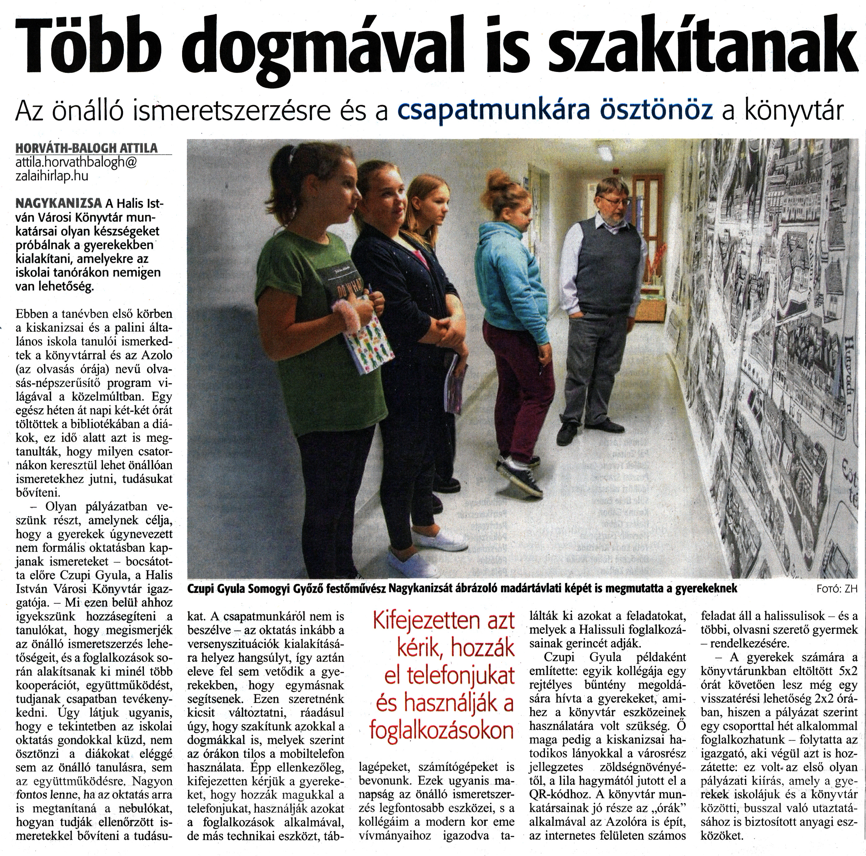 Nyilvános 1429 | 2408 | Zalai Hírlap 2019. október 31. 253. szám 6. oldal - Több dogmával is szakítanak | Több dogmával is szakítanak Az önálló ismeretszerzésre és a csapatmunkára ösztönöz a könyvtár HORVÁTH-BALOGH ATTILA attila.horvathbalogh® zalaihirlap.hu NAGYKANIZSA A Halis István Városi Könyvtár munkatársai olyan készségeket próbálnak a gyerekekben kialakítani, amelyekre az iskolai tanórákon nemigen van lehetőség. Ebben a tanévben első körben a kiskanizsai és a palini általános iskola tanulói ismerkedtek a könyvtárral és az Azolo (az olvasás órája) nevű olva-sás-népszerüsítő program világával a közelmúltban. Egy egész héten át napi két-két órát töltöttek a bibliotékában a diákok, ez idő alatt azt is megtanulták, hogy milyen csatornákon keresztül lehet önállóan ismeretekhez jutni, tudásukat bővíteni. - Olyan pályázatban veszünk részt, amelynek célja, hogy a gyerekek úgynevezett nem formális oktatásban kapjanak ismereteket - bocsátotta előre Czupi Gyula, a Halis István Városi Könyvtár igazgatója. - Mi ezen belül ahhoz igyekszünk hozzásegíteni a tanulókat, hogy megismerjék az önálló ismeretszerzés lehetőségeit, és a foglalkozások során alakítsanak ki minél több kooperációt, együttműködést, tudjanak csapatban tevékenykedni. Úgy látjuk ugyanis, hogy e tekintetben az iskolai oktatás gondokkal küzd, nem ösztönzi a diákokat eléggé sem az önálló tanulásra, sem az együttműködésre. Nagyon fontos lenne, ha az oktatás arra is megtanítaná a nebulókat, hogyan tudják ellenőrzött ismeretekkel bővíteni a tudásu- kat. A csapatmunkáról nem is beszélve - az oktatás inkább a versenyszituációk kialakítására helyez hangsúlyt, így aztán eleve fel sem vetődik a gyerekekben, hogy egymásnak segítsenek. Ezen szeretnénk kicsit változtatni, ráadásul úgy, hogy szakítunk azokkal a dogmákkal is, melyek szerint az órákon tilos a mobiltelefon használata. Épp ellenkezőleg, kifejezetten kérjük a gyerekeket, hogy hozzák magukkal a telefonjukat, használják azokat a foglalkozások alkalmával, de más technikai eszközt, táblagépeket, számítógépeket is bevonunk. Ezek ugyanis manapság az önálló ismeretszerzés legfontosabb eszközei, s a kollégáim a modern kor eme vívmányaihoz igazodva találták ki azokat a feladatokat, melyek a Halissuli foglalkozásainak gerincét adják. Czupi Gyula példaként említette: egyik kollégája egy rejtélyes bűntény megoldására hívta a gyerekeket, amihez a könyvtár eszközeinek használatára volt szükség. Ő maga pedig a kiskanizsai hatodikos lányokkal a városrész jellegzetes zöldségnövényétől, a lila hagymától jutott el a QR-kódhoz. A könyvtár munkatársainak jó része az „órák" alkalmával az Azolóra is épít, az internetes felületen számos feladat áll a halissulisok - és a többi, olvasni szerető gyermek - rendelkezésére. - A gyerekek számára a könyvtárunkban eltöltött 5x2 órát követően lesz még egy visszatérési lehetőség 2x2 órában, hiszen a pályázat szerint egy csoporttal hét alkalommal foglalkozhatunk - folytatta az igazgató, aki végül azt is hozzátette: ez volt az első olyan pályázati kiírás, amely a gyerekek iskolájuk és a könyvtár közötti, busszal való utaztatásához is biztosított anyagi eszközöket. Czupi Gyula Somogyi Győző festőművész Nagykanizsát ábrázoló madártávlati képét is megmutatta a gyerekeknek Fotó: ZH Kifejezetten azt kérik, hozzák el telefonjukat és használják a foglalkozásokon |