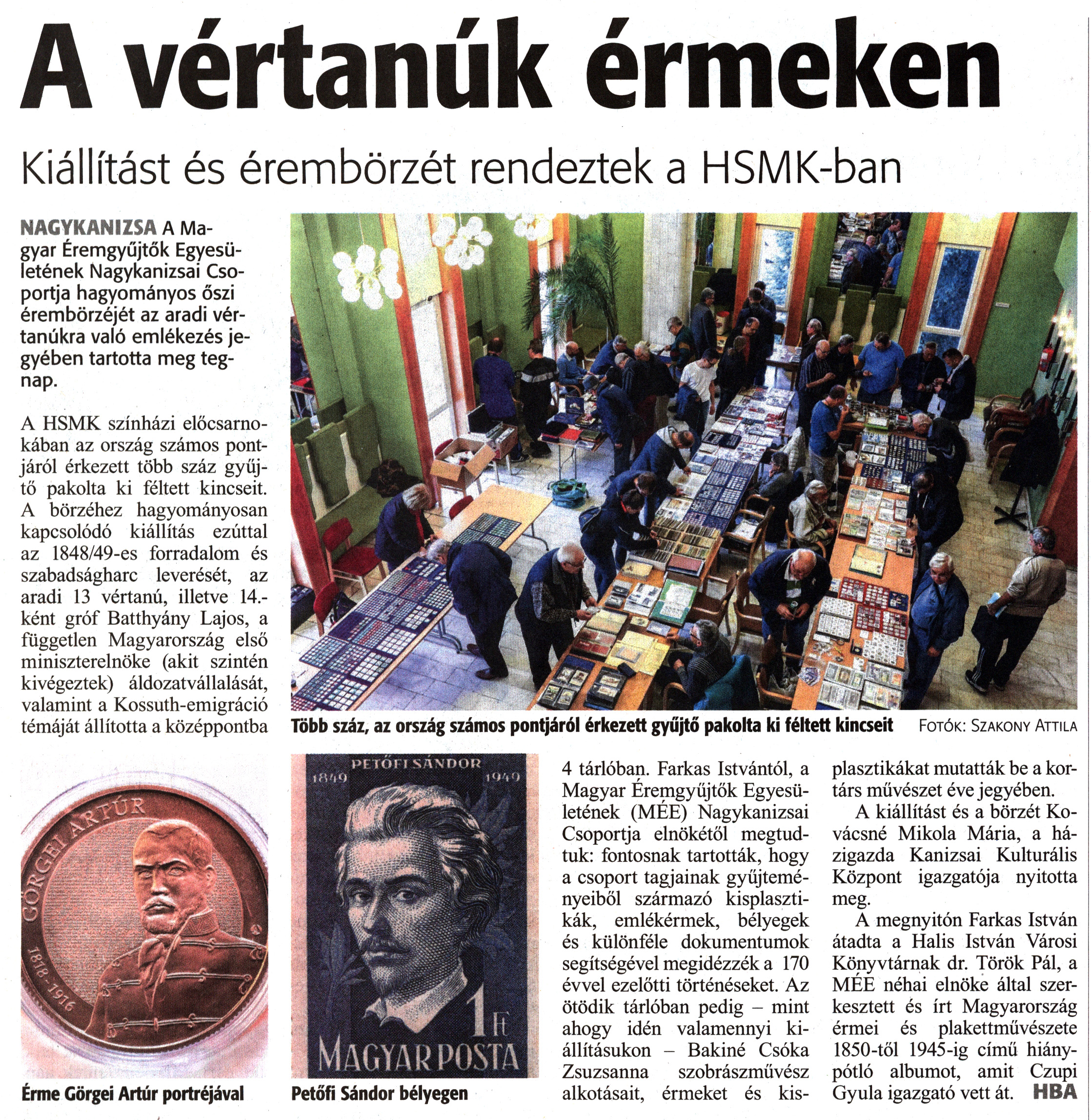 Nyilvános 1346 | 2065 | Zalai Hírlap 2019. november 4. 255. szám 3. oldal - A vértanúk érmeken | A vértanúk érmeken Kiállítást és érembörzét rendeztek a HSMK-ban NAGYKANIZSA A Magyar Éremgyűjtők Egyesületének Nagykanizsai Csoportja hagyományos őszi érembörzéjét az aradi vértanúkra való emlékezés jegyében tartotta meg tegnap. A HSMK színházi előcsarnokában az ország számos pontjáról érkezett több száz gyűjtő pakolta ki féltett kincseit. A börzéhez hagyományosan kapcsolódó kiállítás ezúttal az 1848/49-es forradalom és szabadságharc leverését, az aradi 13 vértanú, illetve 14.-ként gróf Batthyány Lajos, a független Magyarország első miniszterelnöke (akit szintén kivégeztek) áldozatvállalását, valamint a Kossuth-emigráció témáját állította a középpontba 4 tárlóban. Farkas Istvántól, a Magyar Éremgyüjtők Egyesületének (MÉE) Nagykanizsai Csoportja elnökétől megtudtuk: fontosnak tartották, hogy a csoport tagjainak gyűjteményeiből származó kisplasztikák, emlékérmek, bélyegek és különféle dokumentumok segítségével megidézzék a 170 évvel ezelőtti történéseket. Az ötödik tárlóban pedig - mint ahogy idén valamennyi kiállításukon - Bakiné Csóka Zsuzsanna szobrászművész alkotásait, érmeket és kisplasztikákat mutatták be a kortárs művészet éve jegyében. A kiállítást és a börzét Kovácsné Mikola Mária, a házigazda Kanizsai Kulturális Központ igazgatója nyitotta meg. A megnyitón Farkas István átadta a Halis István Városi Könyvtárnak dr. Török Pál, a MÉE néhai elnöke által szerkesztett és írt Magyarország érmei és plakettművészete 1850-től 1945-ig című hiánypótló albumot, amit Czupi Gyula igazgató vett át. HBA Érme Görgei Artúr portréjával Petőfi Sándor bélyegen Több száz, az ország számos pontjáról érkezett gyűjtő pakolta ki féltett kincseit Fotók: Szakony Attila |