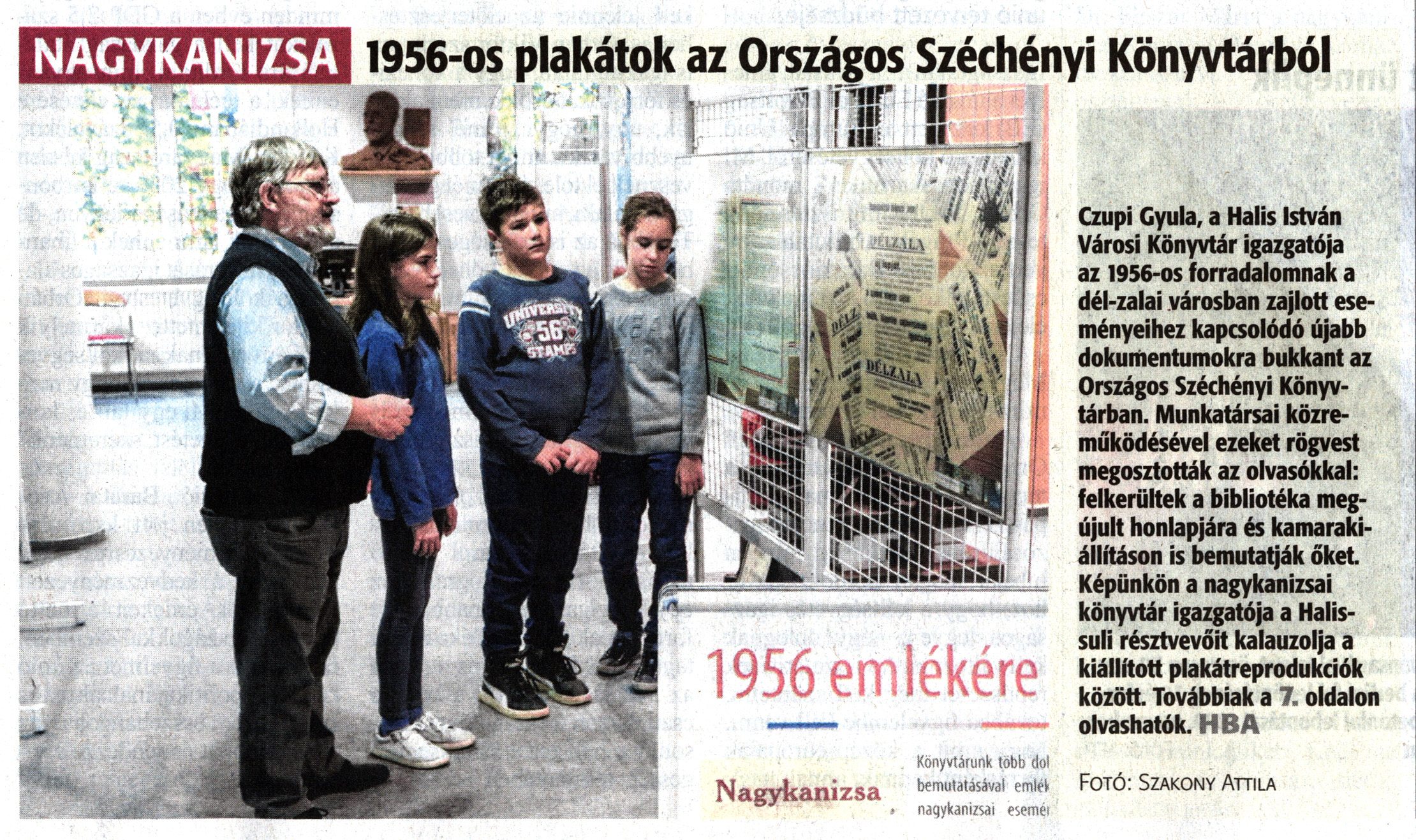 Nyilvános 1177 | 2016 | Zalai Hírlap 2019. november 6. 257. szám 1. oldal - 1956-os plakátok az Országos Széchenyi Könyvtárból | 1956-os plakátok az Országos Széchényi Könyvtárból Czupi Gyula, a Halis István Városi Könyvtár igazgatója az 1956-os forradalomnak a dél-zalai városban zajlott eseményeihez kapcsolódó újabb dokumentumokra bukkant az Országos Széchényi Könyvtárban. Munkatársai közreműködésével ezeket rögvest megosztották az olvasókkal: felkerültek a bibliotéka megújult honlapjára és kamarakiállításon is bemutatják őket. Képünkön a nagykanizsai könyvtár igazgatója a Halis-suli résztvevőit kalauzolja a kiállított plakátreprodukciók között. Továbbiak a 7. oldalon olvashatók. HBA Fotó: Szakony Attila |