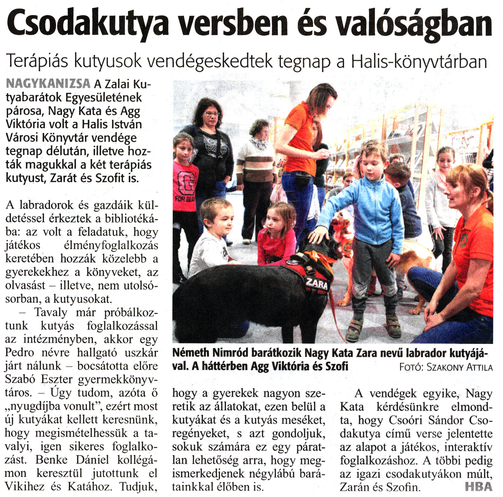 Nyilvános 1739 | 2452 | Zalai Hírlap 2020. február 29. 51. szám 3. oldal | Csodakutya versben és valóságban Terápiás kutyusok vendégeskedtek tegnap a Halis-könyvtárban Németh Nimród barátkozik Nagy Kata Zara nevű labrador kutyájával. A háttérben Agg Viktória és Szofi Fotó: Szakony Attila NAGYKANIZSA A Zalai Kutyabarátok Egyesületének párosa, Nagy Kata és Agg Viktória volt a Halis István Városi Könyvtár vendége tegnap délután, illetve hozták magukkal a két terápiás kutyust, Zarát és Szofit is. A labradorok és gazdáik küldetéssel érkeztek a bibliotékába: az volt a feladatuk, hogy játékos élményfoglalkozás keretében hozzák közelebb a gyerekekhez a könyveket, az olvasást - illetve, nem utolsósorban, a kutyusokat. - Tavaly már próbálkoztunk kutyás foglalkozással az intézményben, akkor egy Pedro névre hallgató uszkár járt nálunk - bocsátotta előre Szabó Eszter gyermekkönyvtáros. - Úgy tudom, azóta ő „nyugdíjba vonult", ezért most új kutyákat kellett keresnünk, hogy megismételhessük a tavalyi, igen sikeres foglalkozást. Benke Dániel kollégámon keresztül jutottunk el Vikihez és Katához. Tudjuk, hogy a gyerekek nagyon szeretik az állatokat, ezen belül a kutyákat és a kutyás meséket, regényeket, s azt gondoljuk, sokuk számára ez egy páratlan lehetőség arra, hogy megismerkedjenek négylábú barátainkkal élőben is. A vendégek egyike, Nagy Kata kérdésünkre elmondta, hogy Csoóri Sándor Csodakutya című verse jelentette az alapot a játékos, interaktív foglalkozáshoz. A többi pedig az igazi csodakutyákon múlt, Zarán és Szofin. HBA |