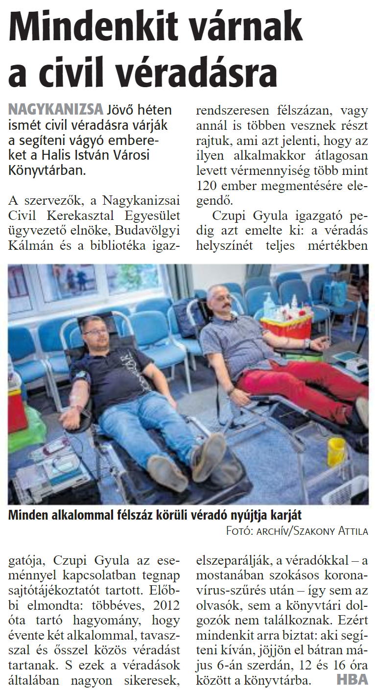 Nyilvános 1427 | 2259 | Zalai Hírlap 2020. április 29. 100. szám 3. oldal | Mindenkit várnak a civil véradásra NAGYKANIZSA Jövő héten ismét civil véradásra várják a segíteni vágyó embereket a Halis István Városi Könyvtárban. A szervezők, a Nagykanizsai Civil Kerekasztal Egyesület ügyvezető elnöke, Budavölgyi Kálmán és a bibliotéka igazgatója, Czupi Gyula az eseménnyel kapcsolatban tegnap sajtótájékoztatót tartott. Előbbi elmondta: többéves, 2012 óta tartó hagyomány, hogy évente két alkalommal, tavasszal és ősszel közös véradást tartanak. S ezek a véradások általában nagyon sikeresek, rendszeresen félszázán, vagy annál is többen vesznek részt rajtuk, ami azt jelenti, hogy az ilyen alkalmakkor átlagosan levett vérmennyiség több mint 120 ember megmentésére elegendő. Czupi Gyula igazgató pedig azt emelte ki: a véradás helyszínét teljes mértékben elszeparálják, a véradókkal - a mostanában szokásos koronavírus-szűrés után - így sem az olvasók, sem a könyvtári dolgozók nem találkoznak. Ezért mindenkit arra biztat: aki segíteni kíván, jöjjön el bátran május 6-án szerdán, 12 és 16 óra között a könyvtárba. HBA Minden alkalommal félszáz körüli véradó nyújtja karját Fotó: archív/Szakony Attila |