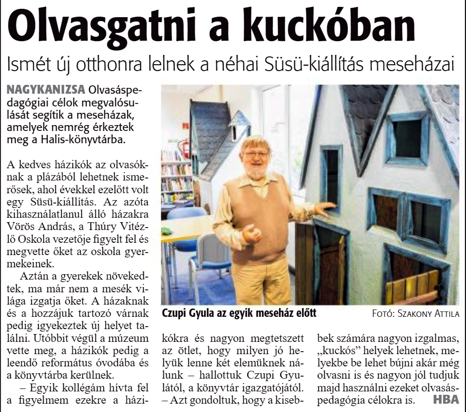 Nyilvános 1434 | 2900 | Zalai Hírlap 2020. június 17. 140. szám 16. oldal | Olvasgatni a kuckóban Ismét új otthonra lelnek a néhai Süsü-kiállítás meseházai NAGYKANIZSA Olvasáspedagógiai célok megvalósulását segítik a meseházak, amelyek nemrég érkeztek meg a Halis-könyvtárba. A kedves házikók az olvasóknak a plázából lehetnek ismerősek, ahol évekkel ezelőtt volt egy Süsü-kiállítás. Az azóta kihasználatlanul álló házakra Vörös András, a Thúry Vitézlő Oskola vezetője figyelt fel és megvette őket az oskola gyermekeinek. Aztán a gyerekek növekedtek, ma már nem a mesék világa izgatja őket. A házaknak és a hozzájuk tartozó várnak pedig igyekeztek új helyet találni. Utóbbit végül a múzeum vette meg, a házikók pedig a leendő református óvodába és a könyvtárba kerülnek. - Egyik kollégám hívta fel a figyelmem ezekre a házikókra és nagyon megtetszett az ötlet, hogy milyen jó helyük lenne két elemüknek nálunk - hallottuk Czupi Gyulától, a könyvtár igazgatójától. - Azt gondoltuk, hogy a kisebbek számára nagyon izgalmas, „kuckós" helyek lehetnek, melyekbe be lehet bújni akár még olvasni is és nagyon jól tudjuk majd használni ezeket olvasáspedagógia célokra is. HBA |