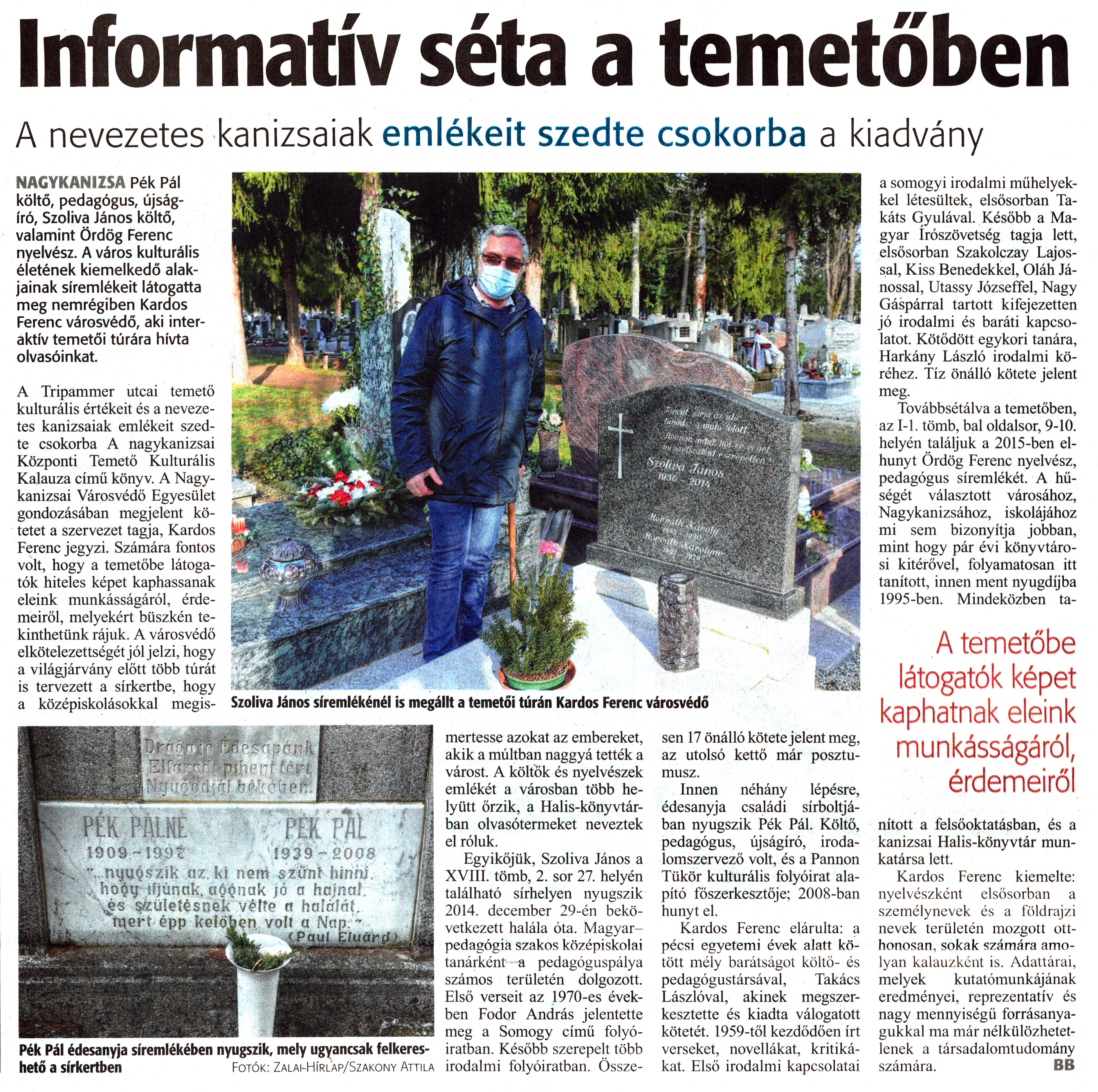 Nyilvános 1599 | 1891 | Zalai Hírlap 2021. április 7. 79. szám 10. oldal | Informatív séta a temetőben A nevezetes kanizsaiak emlékeit szedte csokorba a kiadvány NAGYKANIZSA Pék Pál költő, pedagógus, újságíró, Szoliva János költő, valamint Ördög Ferenc nyelvész. A város kulturális életének kiemelkedő alakjainak síremlékeit látogatta meg nemrégiben Kardos Ferenc városvédő, aki interaktív temetői túrára hívta olvasóinkat. A Tripammer utcai temető kulturális értékeit és a nevezetes kanizsaiak emlékeit szedte csokorba A nagykanizsai Központi Temető Kulturális Kalauza című könyv. A Nagykanizsai Városvédő Egyesület gondozásában megjelent kötetet a szervezet tagja, Kardos Ferenc jegyzi. Számára fontos volt, hogy a temetőbe látogatók hiteles képet kaphassanak eleink munkásságáról, érdemeiről, melyekért büszkén tekinthetünk rájuk. A városvédő elkötelezettségét jól jelzi, hogy a világjárvány előtt több túrát is tervezett a sírkertbe, hogy a középiskolásokkal megismertesse azokat az embereket, akik a múltban naggyá tették a várost. A költők és nyelvészek emlékét a városban több helyütt őrzik, a Halis-könyvtárban olvasótermeket neveztek el róluk. Egyikőjük, Szoliva János a XVIII. tömb, 2. sor 27. helyén található sírhelyen nyugszik 2014. december 29-én bekövetkezett halála óta. Magyarpedagógia szakos középiskolai tanárként a pedagóguspálya számos területén dolgozott. Első verseit az 1970-es években Fodor András jelentette meg a Somogy című folyóiratban. Később szerepelt több irodalmi folyóiratban. Összesen 17 önálló kötete jelent meg, az utolsó kettő már posztumusz. Innen néhány lépésre, édesanyja családi sírboltjában nyugszik Pék Pál. Költő, pedagógus, újságíró, irodalomszervező volt, és a Pannon Tükör kulturális folyóirat alapító főszerkesztője; 2008-ban hunyt el. Kardos Ferenc elárulta: a pécsi egyetemi évek alatt kötött mély barátságot költő- és pedagógustársával, Takács Lászlóval, akinek megszerkesztette és kiadta válogatott kötetét. 1959-től kezdődően írt verseket, novellákat, kritikákat. Első irodalmi kapcsolatai a somogyi irodalmi műhelyekkel létesültek, elsősorban Ta-káts Gyulával. Később a Magyar írószövetség tagja lett, elsősorban Szakolczay Lajossal, Kiss Benedekkel, Oláh Jánossal, Utassy Józseffel, Nagy Gáspárral tartott kifejezetten jó irodalmi és baráti kapcsolatot. Kötődött egykori tanára, Harkány László irodalmi köréhez. Tíz önálló kötete jelent meg. Továbbsétálva a temetőben, az 1-1. tömb, bal oldalsor, 9-10. helyén találjuk a 2015-ben elhunyt Ördög Ferenc nyelvész, pedagógus síremlékét. A hűségét választott városához, Nagykanizsához, iskolájához mi sem bizonyítja jobban, mint hogy pár évi könyvtárosi kitérővel, folyamatosan itt tanított, innen ment nyugdíjba 1995-ben. Mindeközben tanított a felsőoktatásban, és a kanizsai Halis-könyvtár munkatársa lett. Kardos Ferenc kiemelte: nyelvészként elsősorban a személynevek és a földrajzi nevek területén mozgott otthonosan, sokak számára amolyan kalauzként is. Adattárai, melyek kutatómunkájának eredményei, reprezentatív és nagy mennyiségű forrásanyagukkal ma már nélkülözhetetlenek a társadalomtudomány számára. BB Szoliva János síremlékénél is megállt a temetői túrán Kardos Ferenc városvédő Pék Pál édesanyja síremlékében nyugszik, mely ugyancsak felkereshető a sírkertben Fotók: Zalai-Hírl''ap/Szakony Attila |