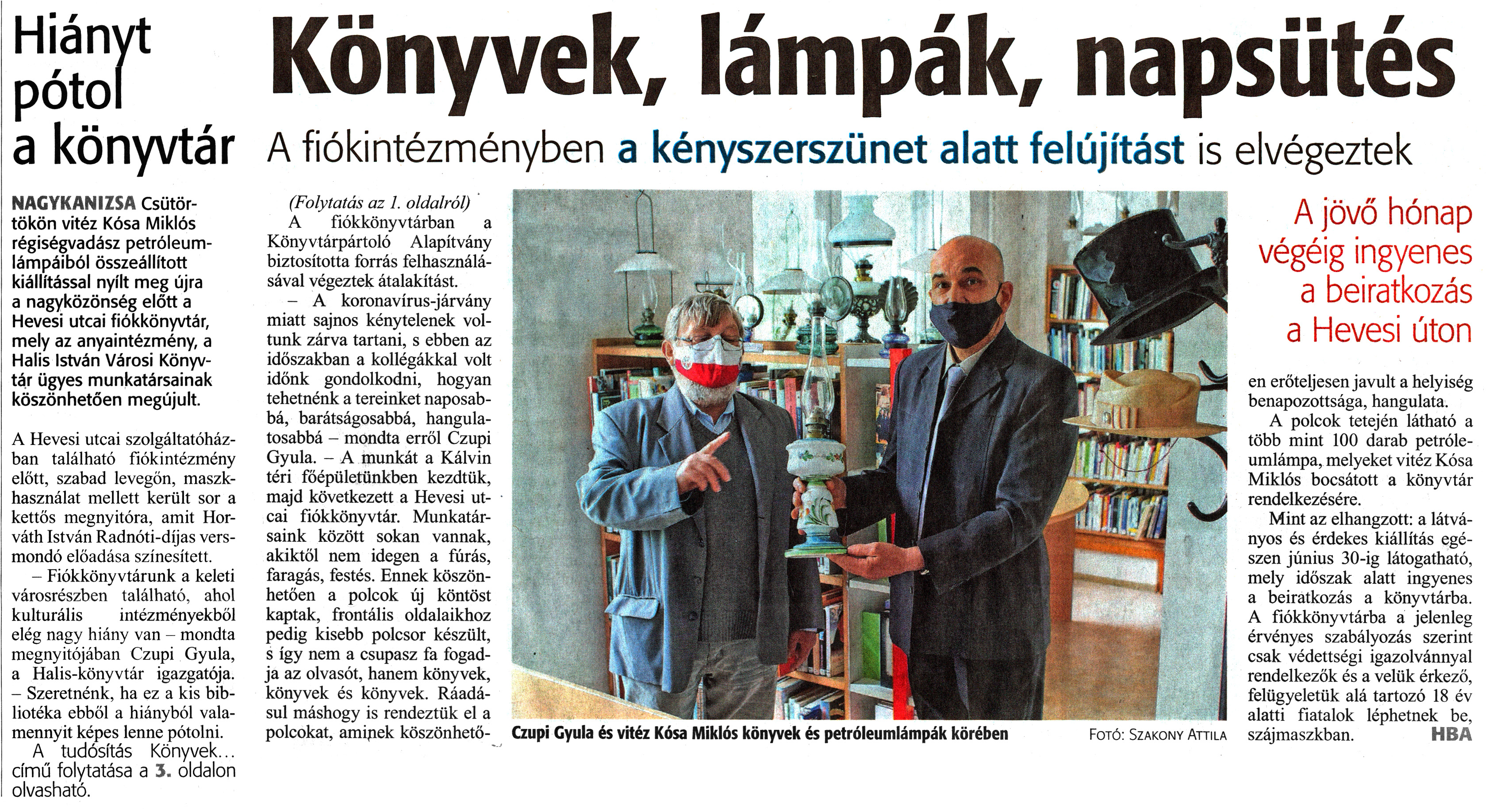 Nyilvános 1643 | 2384 | Zalai Hírlap 2021. május 21. 116. szám 1, 3. oldal | Hiányt pótol a könyvtár Könyvek, lámpák, napsütés NAGYKANIZSA Csütörtökön vitéz Kósa Miklós régiségvadász petróleumlámpáiból összeállított kiállítással nyílt meg újra a nagyközönség előtt a Hevesi utcai fiókkönyvtár, mely az anyaintézmény, a Halis István Városi Könyvtár ügyes munkatársainak köszönhetően megújult. A Hevesi utcai szolgáltatóházban található fiókintézmény előtt, szabad levegőn, maszkhasználat mellett került sor a kettős megnyitóra, amit Horváth István Radnóti-díjas versmondó előadása színesített. - Fiókkönyvtárunk a keleti városrészben található, ahol kulturális intézményekből elég nagy hiány van - mondta megnyitójában Czupi Gyula, a Halis-könyvtár igazgatója. - Szeretnénk, ha ez a kis bibliotéka ebből a hiányból valamennyit képes lenne pótolni. A fiókkönyvtárban a Könyvtárpártoló Alapítvány biztosította forrás felhasználásával végeztek átalakítást. - A koronavírus-járvány miatt sajnos kénytelenek voltunk zárva tartani, s ebben az időszakban a kollégákkal volt időnk gondolkodni, hogyan tehetnénk a tereinket naposabbá, barátságosabbá, hangulatosabbá - mondta erről Czupi Gyula. - A munkát a Kálvin téri főépületünkben kezdtük, majd következett a Hevesi utcai fiókkönyvtár. Munkatársaink között sokan vannak, akiktől nem idegen a fúrás, faragás, festés. Ennek köszönhetően a polcok új köntöst kaptak, frontális oldalaikhoz pedig kisebb polcsor készült, s így nem a csupasz fa fogadja az olvasót, hanem könyvek, könyvek és könyvek. Ráadásul máshogy is rendeztük el a polcokat, aminek köszönhetően erőteljesen javult a helyiség benapozottsága, hangulata. A polcok tetején látható a több mint 100 darab petróleumlámpa, melyeket vitéz Kósa Miklós bocsátott a könyvtár rendelkezésére. Mint az elhangzott: a látványos és érdekes kiállítás egészen június 30-ig látogatható, mely időszak alatt ingyenes a beiratkozás a könyvtárba. A fiókkönyvtárba a jelenleg érvényes szabályozás szerint csak védettségi igazolvánnyal rendelkezők és a velük érkező, felügyeletük alá tartozó 18 év alatti fiatalok léphetnek be, szájmaszkban. HBA Czupi Gyula és vitéz Kósa Miklós könyvek és petróleumlámpák körében Fotó: Szakony Attila |