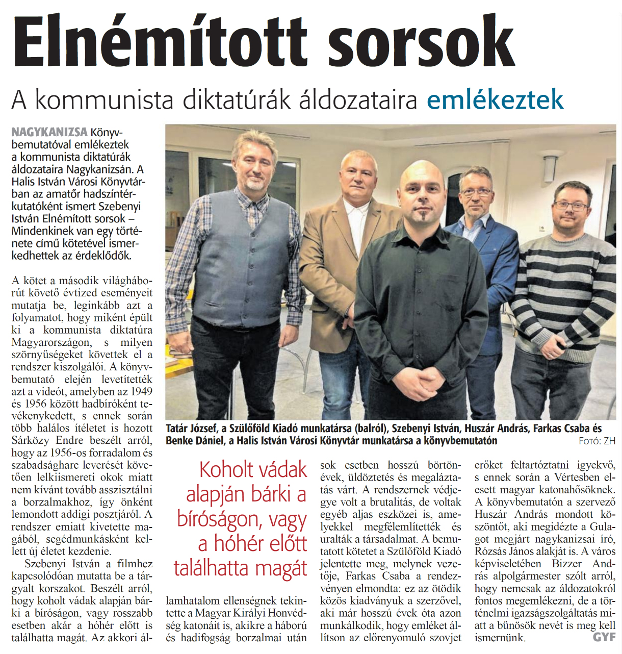 Nyilvános 811 | 1055 | Zalai Hírlap 2024. február 23. 46. szám 2. oldal | Elnémított sorsok A kommunista diktatúrák áldozataira emlékeztek Tatár József, a Szülőföld Kiadó munkatársa (balról), Szebenyi István, Huszár András, Farkas Csaba és Benke Dániel, a Halis István Városi Könyvtár munkatársa a könyvbemutatón Fotó: ZH NAGYKANIZSA Könyvbemutatóval emlékeztek a kommunista diktatúrák áldozataira Nagykanizsán. A Halis István Városi Könyvtárban az amatőr hadszíntérkutatóként ismert Szebenyi István Elnémított sorsok - Mindenkinek van egy története című kötetével ismerkedhettek az érdeklődők. A kötet a második világháborút követő évtized eseményeit mutatja be, leginkább azt a folyamatot, hogy miként épült ki a kommunista diktatúra Magyarországon, s milyen szörnyűségeket követtek el a rendszer kiszolgálói. A könyvbemutató elején levetítették azt a videót, amelyben az 1949 és 1956 között hadbíróként tevékenykedett, s ennek során több halálos ítéletet is hozott Sárközy Endre beszélt arról, hogy az 1956-os forradalom és szabadságharc leverését követően lelkiismereti okok miatt nem kívánt tovább asszisztálni a borzalmakhoz, így önként lemondott addigi posztjáról. A rendszer emiatt kivetette magából, segédmunkásként kellett új életet kezdenie. Szebenyi István a filmhez kapcsolódóan mutatta be a tárgyalt korszakot. Beszélt arról, hogy koholt vádak alapján bárki a bíróságon, vagy rosszabb esetben akár a hóhér előtt is találhatta magát. Az akkori államhatalom ellenségnek tekintette a Magyar Királyi Honvédség katonáit is, akikre a háború és hadifogság borzalmai után sok esetben hosszú börtönévek, üldöztetés és megaláztatás várt. A rendszernek védjegye volt a brutalitás, de voltak egyéb aljas eszközei is, amelyekkel megfélemlítették és uralták a társadalmat. A bemutatott kötetet a Szülőföld Kiadó jelentette meg, melynek vezetője, Farkas Csaba a rendezvényen elmondta: ez az ötödik közös kiadványuk a szerzővel, aki már hosszú évek óta azon munkálkodik, hogy emléket állítson az előrenyomuló szovjet erőket feltartóztatni igyekvő, s ennek során a Vértesben elesett magyar katonahősöknek. A könyvbemutatón a szervező Huszár András mondott köszöntőt, aki megidézte a Gulagot megjárt nagykanizsai író, Rózsás János alakját is. A város képviseletében Bizzer András alpolgármester szólt arról, hogy nemcsak az áldozatokról fontos megemlékezni, de a történelmi igazságszolgáltatás miatt a bűnösök nevét is meg kell ismernünk. |