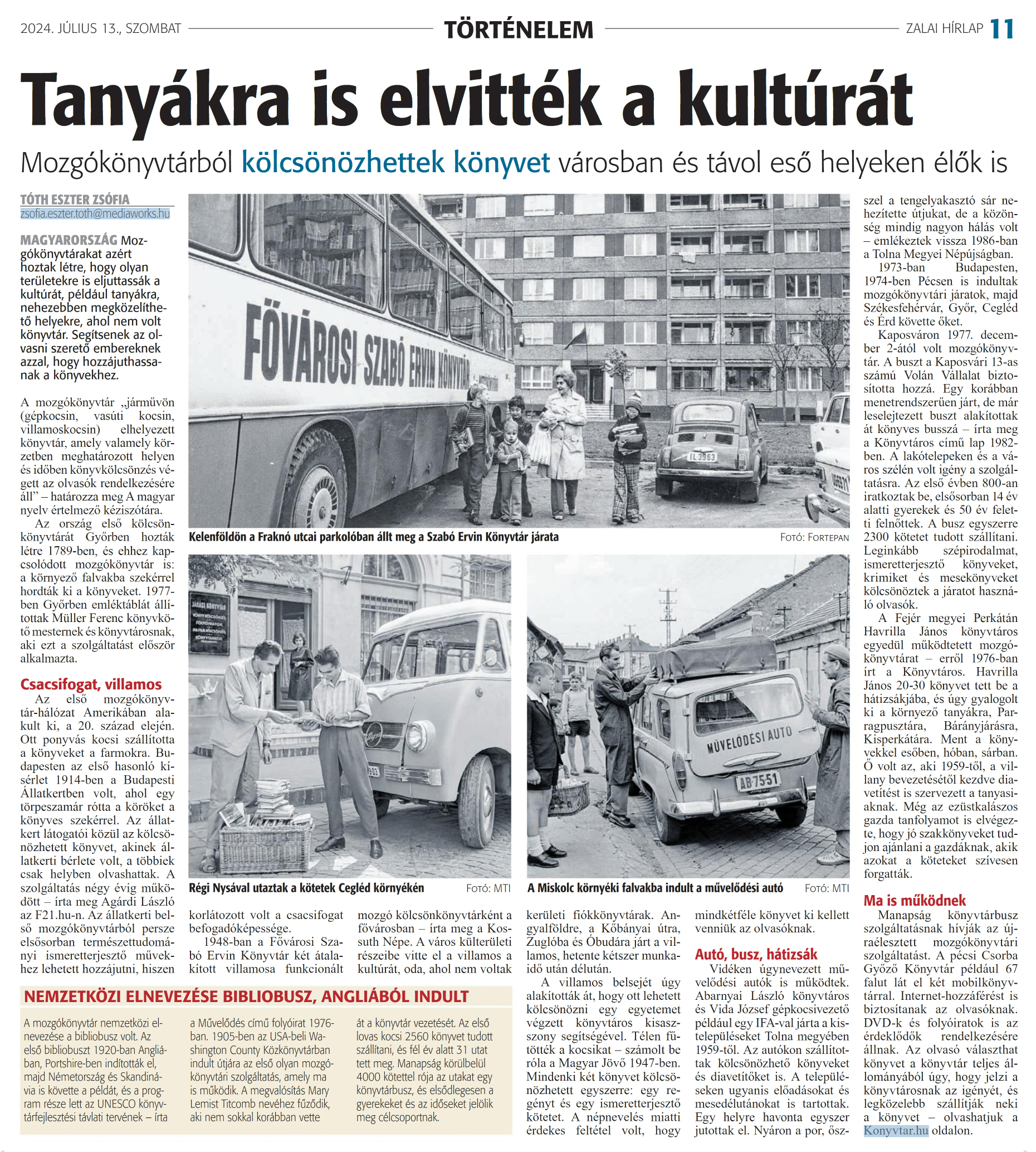 Nyilvános 734 | 952 | Zalai Hírlap 2024. július 13. 162. szám 11. oldal | Tanyákra is elvitték a kultúrát Mozgókönyvtárból kölcsönözhettek könyvet városban és távol eső helyeken élők is TÓTH ESZTER ZSÓFIA zsofia.eszter.toth@mediaworks.hu MAGYARORSZÁG Mozgókönyvtárakat azért hoztak létre, hogy olyan területekre is eljuttassák a kultúrát, például tanyákra, nehezebben megközelíthető helyekre, ahol nem volt könyvtár. Segítsenek az olvasni szerető embereknek azzal, hogy hozzájuthassanak a könyvekhez. A mozgókönyvtár „járművön (gépkocsin, vasúti kocsin, villamoskocsin) elhelyezett könyvtár, amely valamely körzetben meghatározott helyen és időben könyvkölcsönzés végett az olvasók rendelkezésére áll" - határozza meg A magyar nyelv értelmező kéziszótára. Az ország első kölcsön-könyvtárát Győrben hozták létre 1789-ben, és ehhez kapcsolódott mozgókönyvtár is: a környező falvakba szekérrel hordták ki a könyveket. 1977-ben Győrben emléktáblát állítottak Müller Ferenc könyvkötő mesternek és könyvtárosnak, aki ezt a szolsáltatást először alkalmazta. Az első mozgókönyvtár-hálózat Amerikában alakult ki, a 20. század elején. Ott ponyvás kocsi szállította a könyveket a farmokra. Budapesten az első hasonló kísérlet 1914-ben a Budapesti Állatkertben volt, ahol egy törpeszamár rótta a köröket a könyves szekérrel. Az állatkert látogatói közül az kölcsönözhetett könyvet, akinek állatkerti bérlete volt, a többiek csak helyben olvashattak. A szolgáltatás négy évig működött - írta meg Agárdi László az F21.hu-n. Az állatkerti belső mozgókönyvtárból persze elsősorban természettudományi ismeretterjesztő müvekhez lehetett hozzájutni, hiszen korlátozott volt a csacsifogat befogadóképessége. 1948-ban a Fővárosi Szabó Ervin Könyvtár két átalakított villamosa funkcionált mozgó kölcsönkönyvtárként a fővárosban - írta meg a Kossuth Népe. A város külterületi részeibe vitte el a villamos a kultúrát, oda, ahol nem voltak kerületi fiókkönyvtárak. Angyalföldre, a Kőbányai útra, Zuglóba és Óbudára járt a villamos, hetente kétszer munkaidő után délután. A villamos belsejét úgy alakították át, hogy ott lehetett kölcsönözni egy egyetemet végzett könyvtáros kisasszony segítségével. Télen fűtötték a kocsikat - számolt be róla a Magyar Jövő 1947-ben. Mindenki két könyvet kölcsönözhetett egyszerre: egy regényt és egy ismeretterjesztő kötetet. A népnevelés miatti érdekes feltétel volt, hogy mindkétféle könyvet ki kellett venniük az olvasóknak. Vidéken úgynevezett művelődési autók is működtek. Abarnyai László könyvtáros és Vida József gépkocsivezető például egy IFA-val járta a kistelepüléseket Tolna megyében 1959-től. Az autókon szállítottak kölcsönözhető könyveket és diavetítőket is. A településeken ugyanis előadásokat és mesedélutánokat is tartottak. Egy helyre havonta egyszer jutottak el. Nyáron a por, ősszel a tengelyakasztó sár nehezítette útjukat, de a közönség mindig nagyon hálás volt - emlékeztek vissza 1986-ban a Tolna Megyei Népújságban. 1973-ban Budapesten, 1974-ben Pécsen is indultak mozgókönyvtári járatok, majd Székesfehérvár, Győr, Cegléd és Érd követte őket. Kaposváron 1977. december 2-ától volt mozgókönyvtár. A buszt a Kaposvári 13-as számú Volán Vállalat biztosította hozzá. Egy korábban menetrendszerűen járt, de már leselejtezett buszt alakítottak át könyves busszá - írta meg a Könyvtáros című lap 1982-ben. A lakótelepeken és a város szélén volt igény a szolgáltatásra. Az első évben 800-an iratkoztak be, elsősorban 14 év alatti gyerekek és 50 év feletti felnőttek. A busz egyszerre 2300 kötetet tudott szállítani. Leginkább szépirodalmat, ismeretterjesztő könyveket, krimiket és mesekönyveket kölcsönöztek a járatot használó olvasók. A Fejér megyei Perkátán Havrilla János könyvtáros egyedül működtetett mozgókönyvtárat - erről 1976-ban írt a Könyvtáros. Havrilla János 20-30 könyvet tett be a hátizsákjába, és úgy gyalogolt ki a környező tanyákra, Parragpusztára, Bárányjárásra, Kisperkátára. Ment a könyvekkel esőben, hóban, sárban. Ő volt az, aki 1959-től, a villany bevezetésétől kezdve diavetítést is szervezett a tanyasiaknak. Még az ezüstkalászos gazda tanfolyamot is elvégezte, hogy jó szakkönyveket tudjon ajánlani a gazdáknak, akik azokat a köteteket szívesen forgatták. Ma is működnek Manapság könyvtárbusz szolgáltatásnak hívják az újraélesztett mozgókönyvtári szolgáltatást. A pécsi Csorba Győző Könyvtár például 67 falut lát el két mobilkönyvtárral. Internet-hozzáférést is biztosítanak az olvasóknak. DVD-k és folyóiratok is az érdeklődők rendelkezésére állnak. Az olvasó választhat könyvet a könyvtár teljes állományából úgy, hogy jelzi a könyvtárosnak az igényét, és legközelebb szállítják neki a könyvet - olvashatjuk a Konyvtar.hu oldalon. NEMZETKÖZI ELNEVEZÉSE BIBLIOBUSZ, ANGLIÁBÓL INDULT A mozgókönyvtár nemzetközi elnevezése a bibliobusz volt. Az első bibliobuszt 1920-ban Angliában, Portshire-ben indították el, majd Németország és Skandinávia is követte a példát, és a program része lett az UNESCO könyvtárfejlesztési távlati tervének - írta a Művelődés című folyóirat 1976-ban. 1905-ben az USA-beli Washington County Közkönyvtárban indult útjára az első olyan mozgókönyvtári szolgáltatás, amely ma is működik. A megvalósítás Mary Lemist Titcomb nevéhez fűződik, aki nem sokkal korábban vette át a könyvtár vezetését. Az első lovas kocsi 2560 könyvet tudott szállítani, és fél év alatt 31 utat tett meg. Manapság körülbelül 4000 kötettel rója az utakat egy könyvtárbusz