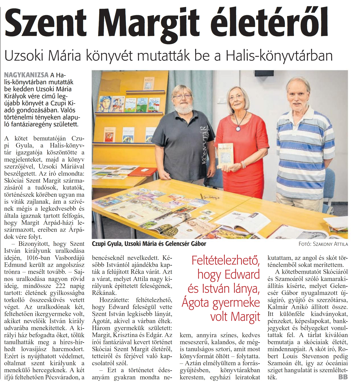 Nyilvános 758 | 1038 | Zalai Hírlap 2024. szeptember 12. 213. szám 6. oldal | Szent Margit életéről Uzsoki Mária könyvét mutatták be a Halis-könyvtárban NAGYKANIZSA A Halis-könyvtárban mutatták be kedden Uzsoki Mária Királyok vére című legújabb könyvét a Czupi Kiadó gondozásában. Valós történelmi tényeken alapuló fantáziaregény született. A kötet bemutatóján Czupi Gyula, a Halis-könyvtár igazgatója köszöntötte a megjelenteket, majd a könyv szerzőjével, Uzsoki Máriával beszélgetett. Az író elmondta: Skóciai Szent Margit származásáról a tudósok, kutatók, történészek körében ugyan ma is viták zajlanak, ám a szívének mégis a legkedvesebb és általa igaznak tartott felfogás, hogy Margit Árpád-házi leszármazott, ereiben az Árpádok vére folyt. - Bizonyított, hogy Szent István királyunk uralkodása idején, 1016-ban Vasbordájú Edmund került az angolszász trónra - mesélt tovább. - Sajnos uralkodása nagyon rövid ideig, mindössze 222 napig tartott: életének gyilkosságba torkolló összeesküvés vetett véget. Az uralkodónak két, feltehetően ikergyermeke volt, akiket nevelőik István király udvarába menekítettek. A királyi ház befogadta őket, tőlük tanulhatták meg a híres-hírhedt lovasíjász harcmodort. Ezért is nyújthatott védelmet, oltalmat szent királyunk a menekülő hercegeknek. A két ifjú feltehetően Pécsváradon, a bencéseknél nevelkedett. Később Istvántól ajándékba kapták a felújított Réka várát. Azt a várat, melyet Attila nagy királyunk építtetett feleségének, Rékának. Hozzátette: feltételezhető, hogy Edvvard feleségül vette Szent István legkisebb lányát, Ágotát, akivel a várban éltek. Három gyermekük született: Margit, Krisztina és Edgár. Az írói fantáziával kevert történet Skóciai Szent Margit életéről, tetteiről és férjével való kapcsolatról szól. - Ezt a történetet édesanyám gyakran mondta nekem, annyira színes, kedves meseszerű, kalandos, de mégis tanulságos sztori, amit most könyvformát öltött - folytatta. - Aztán elmélyültem a forrásgyűjtésben, könyvtárakban kerestem, egyházi leiratokat kutattam, az angol és skót történelemből sokat merítettem. A kötetbemutatót Skóciáról és Szamoáról szóló kamarakiállítás kísérte, melyet Gelencsér Gábor nyugalmazott újságíró, gyűjtő és szerzőtársa, Kalmár Ánikó állított össze. Itt különféle kiadványokat, pénzeket, képeslapokat, bankjegyeket és bélyegeket vonultattak fel. A tárlat kiválóan bemutatja a skóciaiak életét, mindennapjait. A skót író, Róbert Louis Stevenson pedig Szamoán élt, így az óceániai sziget hangulatát is szemléltették. BB Czupi Gyula, Uzsoki Mária és Gelencsér Gábor Fotó: Szakony Attila |