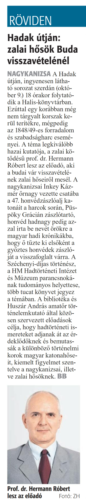 Nyilvános 857 | 1059 | Zalai Hírlap 2024. október 7. 234. szám 2. oldal | RÖVIDEN Hadak útján: zalai hősök Buda visszavételénél NAGYKANIZSA A Hadak útján, ingyenesen látható sorozat szerdán (október 9.) 18 órakor folytatódik a Halis-könyvtárban. Ezúttal egy korábban még nem tárgyalt korszak kerül terítékre, mégpedig az 1848/49-es forradalom és szabadságharc eseményei. A téma legkiválóbb hazai kutatója, a zalai kötődésű prof. dr. Hermann Róbert lesz az előadó, aki a budai vár visszavételének zalai hőseiről mesél. A nagykanizsai Inkey Kázmér őrnagy vezette csatába a 47. honvédzászlóalj katonáit a harcok során, Püspöky Grácián zászlótartó, honvéd hadnagy pedig azzal írta be nevét örökre a magyar hadi krónikákba, hogy ő tűzte ki elsőként a győztes honvédek zászlóját a visszafoglalt várra. A Széchenyi-díjas történész, a HM Hadtörténeti Intézet és Múzeum parancsnokának tudományos helyettese, több tucat könyvet jegyez a témában. A bibliotéka és Huszár András amatőr történelemkutató által közösen szervezett előadások célja, hogy hadtörténeti ismereteket adjanak át az érdeklődőknek és bemutassák a különböző történelmi korok magyar katonahőseit, kiemelt figyelmet szentelve a nagykanizsai, illetve zalai hősöknek. BB Prof. dr. Hermann Róbert lesz az előadó Fotó: ZH |