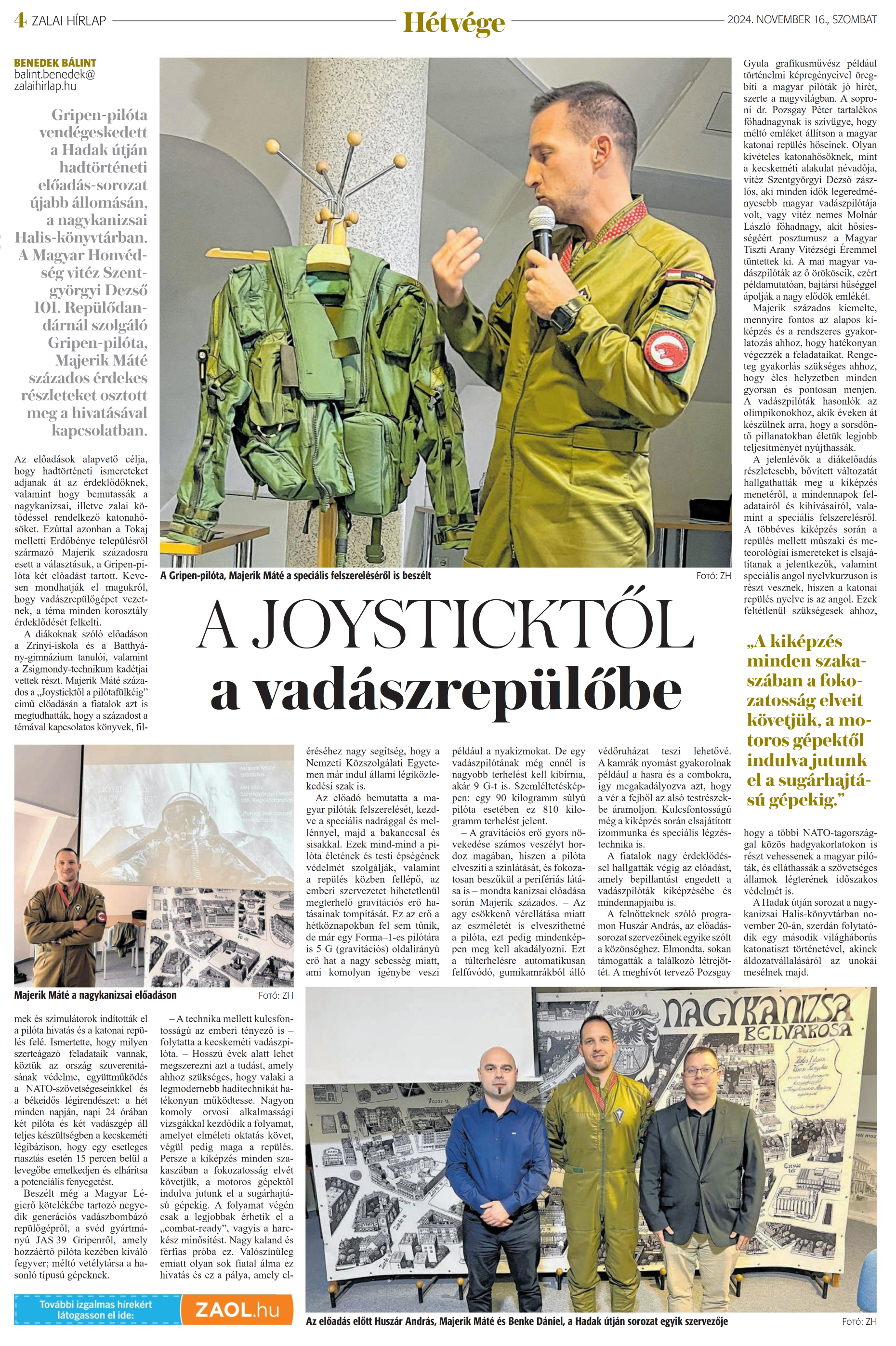 Nyilvános 869 | 971 | Zalai Hírlap 2024. november 16. 267. szám 4. oldal | A JOYSTICKTŐL a vadászrepülőbe BENEDEK BÁLINT balint.benedek@ zalaihirlap.hu Gripen-pilóta vendégeskedett a Hadak útján hadtörténeti előadás-sorozat ujabb állomásán, a nagykanizsai Halis-könyvtárban. A Magyar Honvédség vitéz Szent-györgyi Dezső 101. Repülődandárnál szolgáló Gripen-pilóta, Majerik Máté százados érdekes részleteket osztott meg a hivatásával kapcsolatban. Az előadások alapvető célja, hogy hadtörténeti ismereteket adjanak át az érdeklődőknek, valamint hogy bemutassák a nagykanizsai, illetve zalai kötődéssel rendelkező katonahősöket. Ezúttal azonban a Tokaj melletti Erdőbénye településről származó Majerik századosra esett a választásuk, a Gripen-pilóta két előadást tartott. Kevesen mondhatják el magukról, hogy vadászrepülőgépet vezetnek, a téma minden korosztály érdeklődését felkelti. A diákoknak szóló előadáson a Zrínyi-iskola és a Batthyány-gimnázium tanulói, valamint a Zsigmondy-technikum kadétjai vettek részt. Majerik Máté százados a „Joysticktől a pilótafülkéig" című előadásán a fiatalok azt is megtudhatták, hogy a századost a témával kapcsolatos könyvek, filmek és szimulátorok indították el a pilóta hivatás és a katonai repülés felé. Ismertette, hogy milyen szerteágazó feladataik vannak, köztük az ország szuverenitásának védelme, együttműködés a NATO-szövetségeseinkkel és a békeidős légirendészet: a hét minden napján, napi 24 órában két pilóta és két vadászgép áll teljes készültségben a kecskeméti légibázison, hogy egy esetleges riasztás esetén 15 percen belül a levegőbe emelkedjen és elhárítsa a potenciális fenyegetést. Beszélt még a Magyar Légierő kötelékébe tartozó negyedik generációs vadászbombázó repülőgépről, a svéd gyártmányú JAS 39 Gripenről, amely hozzáértő pilóta kezében kiváló fegyver; méltó vetélytársa a hasonló típusú gépeknek. -A technika mellett kulcsfontosságú az emberi tényező is - folytatta a kecskeméti vadászpilóta. - Hosszú évek alatt lehet megszerezni azt a tudást, amely ahhoz szükséges, hogy valaki a legmodernebb haditechnikát hatékonyan működtesse. Nagyon komoly orvosi alkalmassági vizsgákkal kezdődik a folyamat, amelyet elméleti oktatás követ, végül pedig maga a repülés. Persze a kiképzés minden szakaszában a fokozatosság elvét követjük, a motoros gépektől indulva jutunk el a sugárhajtású gépekig. A folyamat végén csak a legjobbak érhetik el a „combat-ready", vagyis a harckész minősítést. Nagy kaland és férfias próba ez. Valószínűleg emiatt olyan sok fiatal álma ez hivatás és ez a pálya, amely eléréséhez nagy segítség, hogy a Nemzeti Közszolgálati Egyetemen már indul állami légiközlekedési szak is. Az előadó bemutatta a magyar pilóták felszerelését, kezdve a speciális nadrággal és mellénnyel, majd a bakanccsal és sisakkal. Ezek mind-mind a pilóta életének és testi épségének védelmét szolgálják, valamint a repülés közben fellépő, az emberi szervezetet hihetetlenül megterhelő gravitációs erő hatásainak tompítását. Ez az erő a hétköznapokban fel sem tűnik, de már egy Forma-l-es pilótára is 5 G (gravitációs) oldalirányú erő hat a nagy sebesség miatt, ami komolyan igénybe veszi például a nyakizmokat. De egy vadászpilótának még ennél is nagyobb terhelést kell kibírnia, akár 9 G-t is. Szemléltetésképpen: egy 90 kilogramm súlyú pilóta esetében ez 810 kilogramm terhelést jelent. - A gravitációs erő gyors növekedése számos veszélyt hordoz magában, hiszen a pilóta elveszíti a színlátását, és fokozatosan beszűkül a perifériás látása is - mondta kanizsai előadása során Majerik százados. - Az agy csökkenő vérellátása miatt az eszméletét is elveszíthetné a pilóta, ezt pedig mindenképpen meg kell akadályozni. Ezt a túlterhelésre automatikusan felfúvódó, gumikamrákból álló védőruházat teszi lehetővé. A kamrák nyomást gyakorolnak például a hasra és a combokra, így megakadályozva azt, hogy a vér a fejből az alsó testrészekbe áramoljon. Kulcsfontosságú még a kiképzés során elsajátított izommunka és speciális légzéstechnika is. A fiatalok nagy érdeklődéssel hallgatták végig az előadást, amely bepillantást engedett a vadászpilóták kiképzésébe és mindennapjaiba is. A felnőtteknek szóló programon Huszár András, az előadássorozat szervezőinek egyike szólt a közönséghez. Elmondta, sokan támogatták a találkozó létrejöttét. A meghívót tervező Pozsgay Gyula grafikusművész például történelmi képregényeivel öregbíti a magyar pilóták jó hírét, szerte a nagyvilágban. A soproni dr. Pozsgay Péter tartalékos főhadnagynak is szívügye, hogy méltó emléket állítson a magyar katonai repülés hőseinek. Olyan kivételes katonahősöknek, mint a kecskeméti alakulat névadója, vitéz Szentgyörgyi Dezső zászlós, aki minden idők legeredményesebb magyar vadászpilótája volt, vagy vitéz nemes Molnár László főhadnagy, akit hősiességéért posztumusz a Magyar Tiszti Arany Vitézségi Éremmel tüntettek ki. A mai magyar vadászpilóták az ő örököseik, ezért példamutatóan, bajtársi hűséggel ápolják a nagy elődök emlékét. Majerik százados kiemelte, mennyire fontos az alapos kiképzés és a rendszeres gyakorlatozás ahhoz, hogy hatékonyan végezzék a feladataikat. Rengeteg gyakorlás szükséges ahhoz, hogy éles helyzetben minden gyorsan és pontosan menjen. A vadászpilóták hasonlók az olimpikonokhoz, akik éveken át készülnek arra, hogy a sorsdöntő pillanatokban életük legjobb teljesítményét nyújthassák. A jelenlévők a diákelőadás részletesebb, bővített változatát hallgathatták meg a 