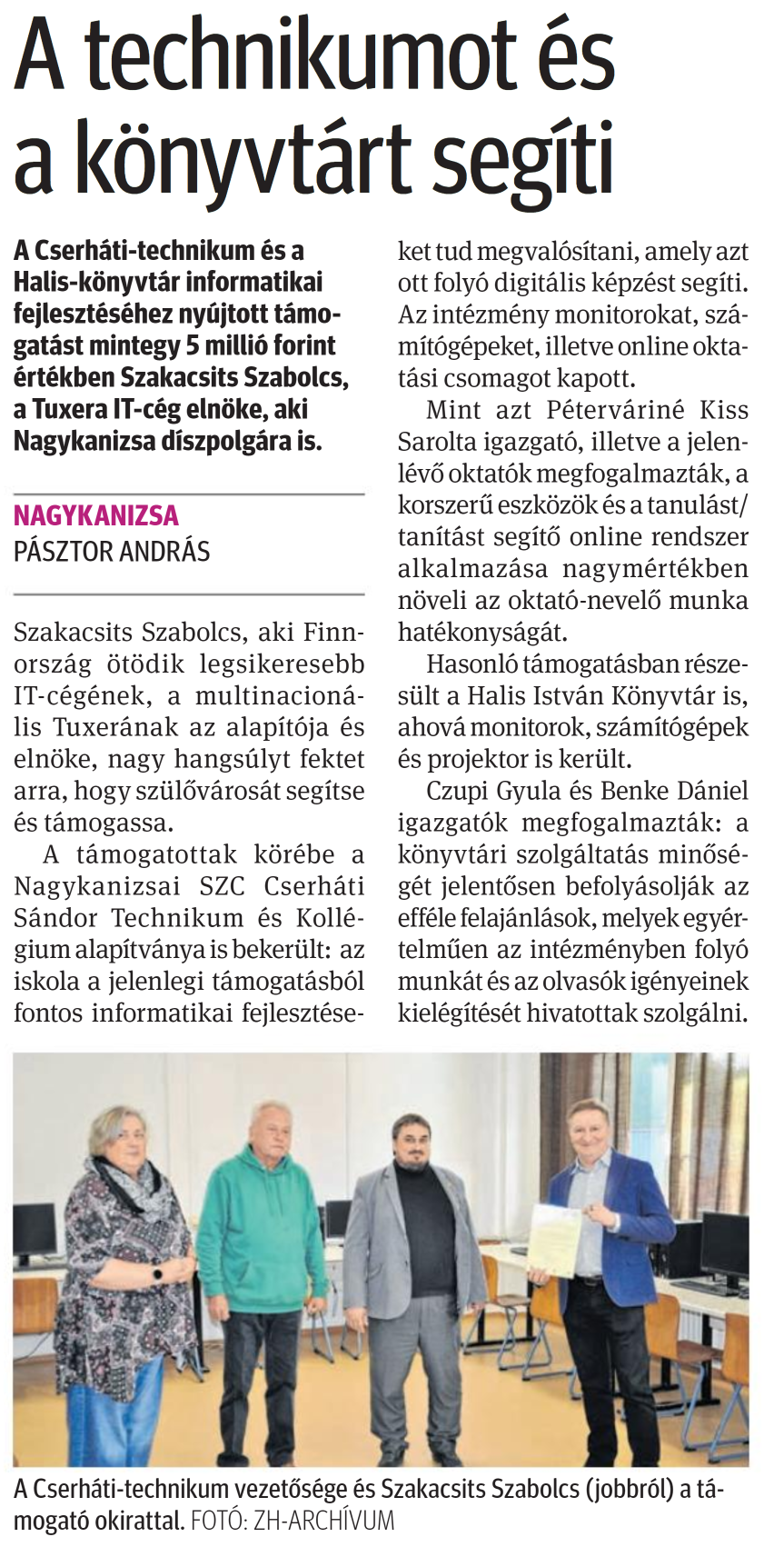 Nyilvános 728 | 1013 | Zalai Hírlap 2024. december 18. 294. szám 5. oldal | A technikumot és a könyvtárt segíti A Cserháti-technikum és a Halis-könyvtár informatikai fejlesztéséhez nyújtott támogatást mintegy 5 millió forint értékben Szakacsits Szabolcs, a Tuxera IT-cég elnöke, aki Nagykanizsa díszpolgára is. NAGYKANIZSA PÁSZTOR ANDRÁS Szakacsits Szabolcs, aki Finnország ötödik legsikeresebb IT-cégének, a multinacionális Tuxerának az alapítója és elnöke, nagy hangsúlyt fektet arra, hogy szülővárosát segítse és támogassa. A támogatottak körébe a Nagykanizsai SZC Cserháti Sándor Technikum és Kollégium alapítványa is bekerült: az iskola a jelenlegi támogatásból fontos informatikai fejlesztéseket tud megvalósítani, amely azt ott folyó digitális képzést segíti. Az intézmény monitorokat, számítógépeket, illetve online oktatási csomagot kapott. Mint azt Péterváriné Kiss Sarolta igazgató, illetve a jelenlévő oktatók megfogalmazták, a korszerű eszközök és a tanulást/ tanítást segítő online rendszer alkalmazása nagymértékben növeli az oktató-nevelő munka hatékonyságát. Hasonló támogatásban részesült a Halis István Könyvtár is, ahová monitorok, számítógépek és projektor is került. Czupi Gyula és Benke Dániel igazgatók megfogalmazták: a könyvtári szolgáltatás minőségét jelentősen befolyásolják az efféle felajánlások, melyek egyértelműen az intézményben folyó munkát és az olvasók igényeinek kielégítését hivatottak szolgálni. A Cserháti-technikum vezetősége és Szakacsits Szabolcs (jobbról) a támogató okirattal. FOTÓ: ZH-ARCHÍVUM |