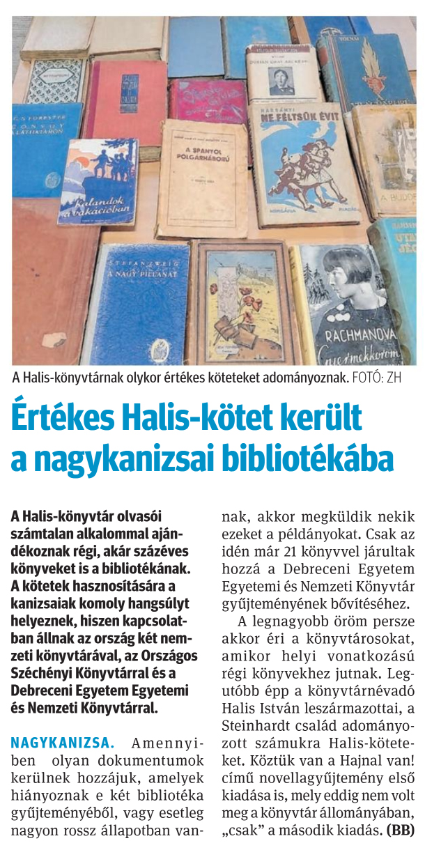 Nyilvános 621 | 827 | Zalai Hírlap 2025. február 24. 46. szám 16. oldal | A Halis-könyvtárnak olykor értékes köteteket adományoznak. FOTÓ: ZH Értékes Halis-kötet került a nagykanizsai bibliotékába A Halis-könyvtár olvasói számtalan alkalommal ajándékoznak régi, akár százéves könyveket is a bibliotékának. A kötetek hasznosítására a kanizsaiak komoly hangsúlyt helyeznek, hiszen kapcsolatban állnak az ország két nemzeti könyvtárával, az Országos Széchényi Könyvtárral és a Debreceni Egyetem Egyetemi és Nemzeti Könyvtárral. NAGYKANIZSA. Amennyiben olyan dokumentumok kerülnek hozzájuk, amelyek hiányoznak e két bibliotéka gyűjteményéből, vagy esetleg nagyon rossz állapotban vannak, akkor megküldik nekik ezeket a példányokat. Csak az idén már 21 könyvvel járultak hozzá a Debreceni Egyetem Egyetemi és Nemzeti Könyvtár gyűjteményének bővítéséhez. A legnagyobb öröm persze akkor éri a könyvtárosokat, amikor helyi vonatkozású régi könyvekhez jutnak. Legutóbb épp a könyvtárnévadó Halis István leszármazottai, a Steinhardt család adományozott számukra Halis-köteteket. Köztük van a Hajnal van! című novellagyűjtemény első kiadása is, mely eddig nem volt meg a könyvtár állományában, „csak" a második kiadás. (BB) |