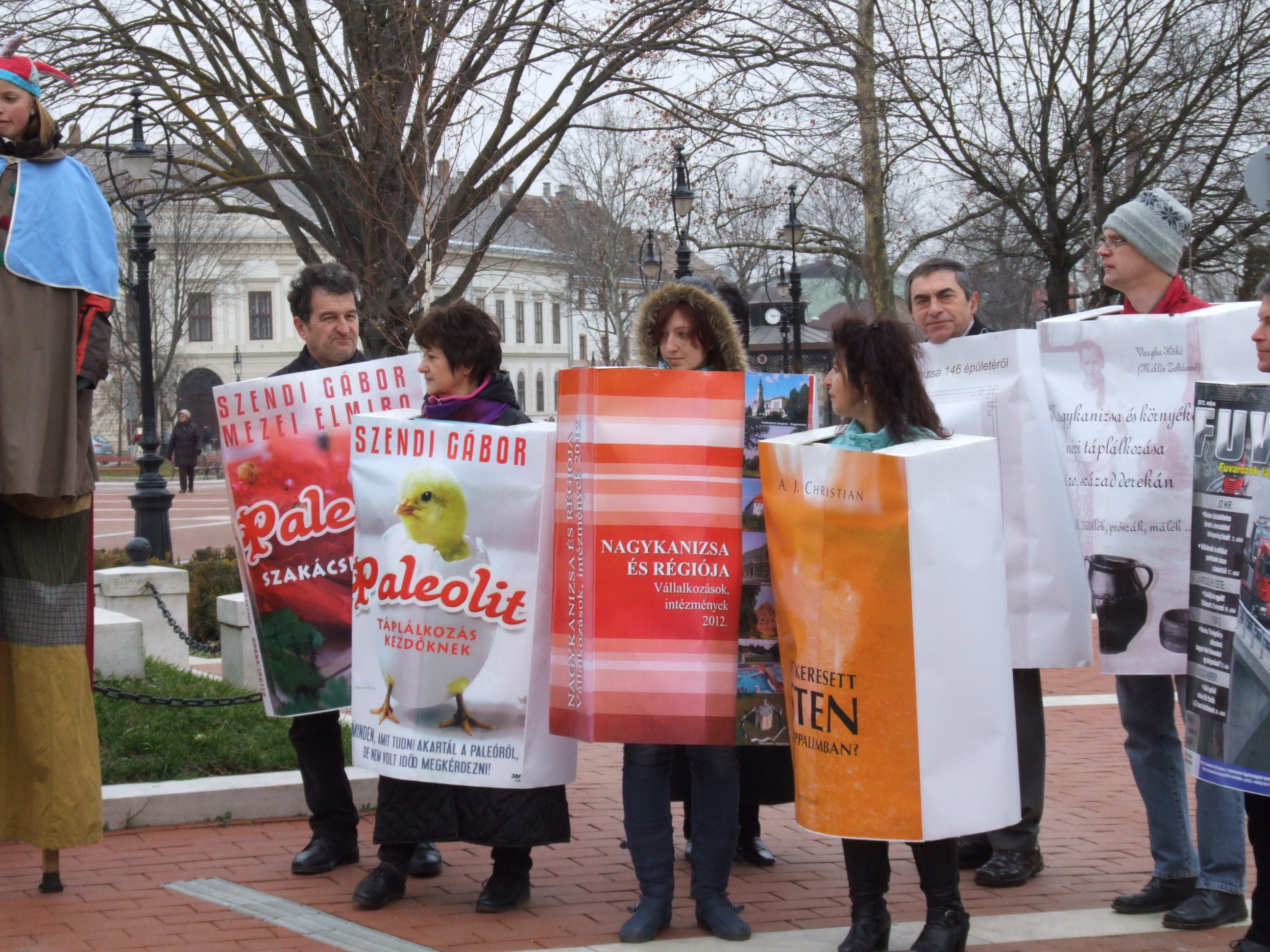 Nyilvános 829 | 1287 | 2013. február 9. A farsangi fánkfesztiválra készülve felhívásban kértük olvasóinkat, hogy öltsék magukra kedves könyvüket. Egy „könyvespolcnyi” jelentkező vette magára kedves olvasmányát, az ő vonulásukról készültek ezek a képek. A környezetükben néhol láthatók a Nagykanizsai Gólyalábasok, akik szintén a könyvtárhoz kötődnek. A „felvonuló kötetek” a könyvtár épületében még megtekinthetők. | |