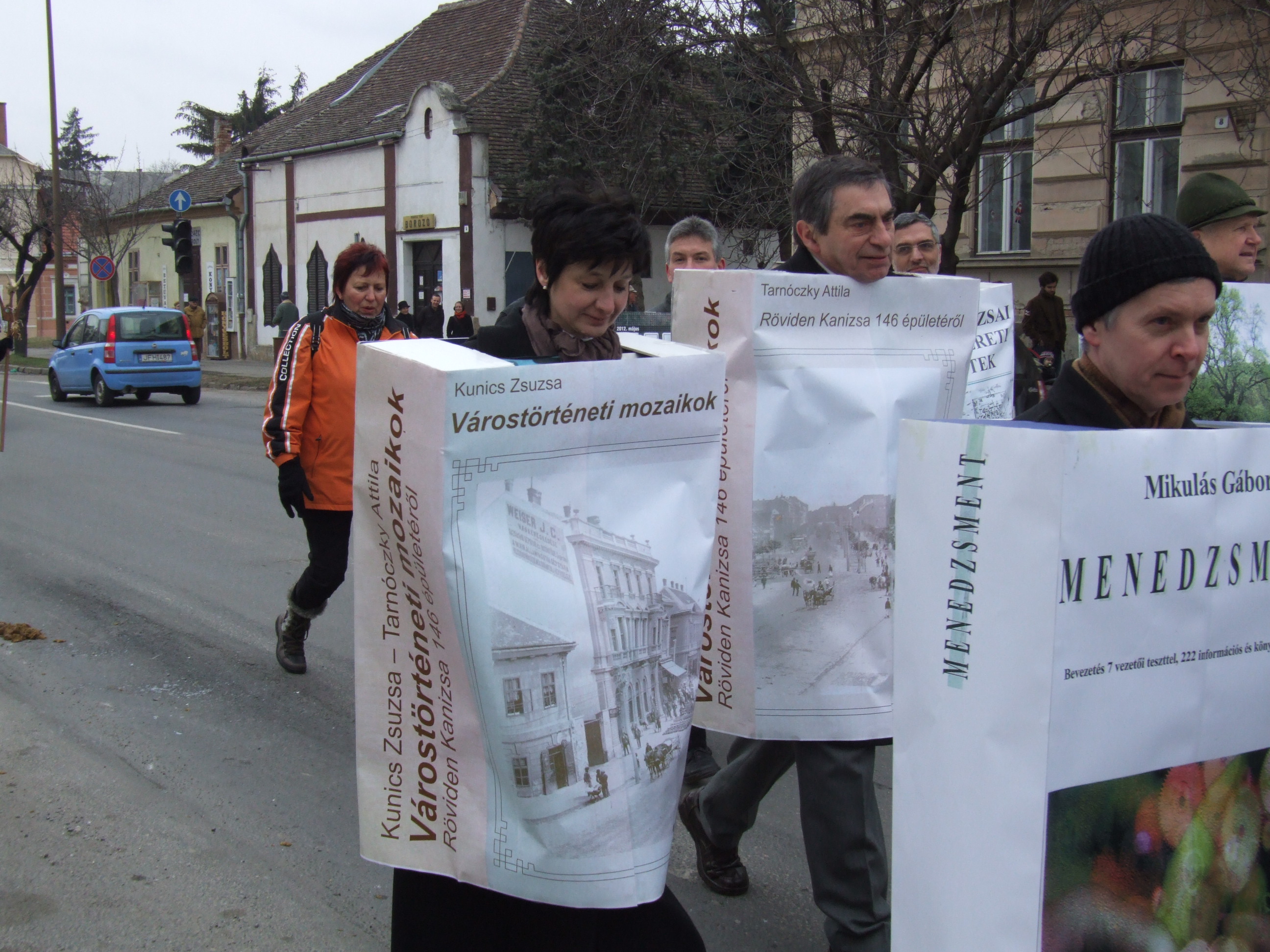 Nyilvános 1004 | 1358 | 2013. február 9. A farsangi fánkfesztiválra készülve felhívásban kértük olvasóinkat, hogy öltsék magukra kedves könyvüket. Egy „könyvespolcnyi” jelentkező vette magára kedves olvasmányát, az ő vonulásukról készültek ezek a képek. A környezetükben néhol láthatók a Nagykanizsai Gólyalábasok, akik szintén a könyvtárhoz kötődnek. A „felvonuló kötetek” a könyvtár épületében még megtekinthetők. | |
