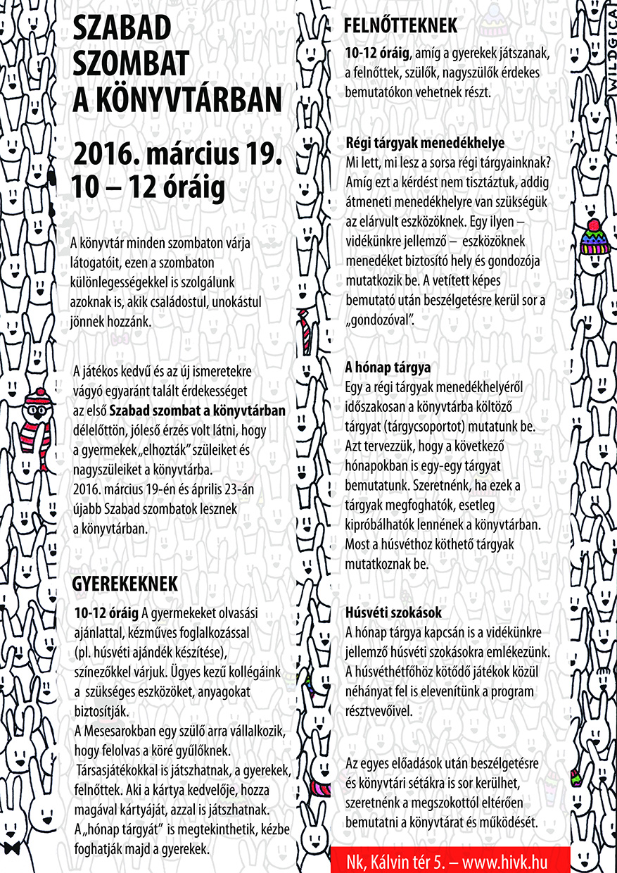 Nyilvános 1228 | 2469 | SZABAD | SZOMBAT A KÖNYVTÁRBAN 2016. március 19. 10 – 12 óráig A könyvtár minden szombaton várja látogatóit, ezen a szombaton különlegességekkel is szolgálunk azoknak is, akik családostul, unokástul jönnek hozzánk. A játékos kedvű és az új ismeretekre vágyó egyaránt talált érdekességet az első Szabad szombat a könyvtárban délelőttön, jóleső érzés volt látni, hogy a gyermekek „elhozták” szüleiket és nagyszüleiket a könyvtárba. 2016. március 19-én és április 23-án újabb Szabad szombatok lesznek a könyvtárban. GYEREKEKNEK 10-12 óráig A gyermekeket olvasási ajánlattal, kézműves foglalkozással (pl. húsvéti ajándék készítése), színezőkkel várjuk. Ügyes kezű kollégáink a szükséges eszközöket, anyagokat biztosítják. A Mesesarokban egy szülő arra vállalkozik, hogy felolvas a köré gyűlőknek. Társasjátékokkal is játszhatnak, a gyerekek, felnőttek. Aki a kártya kedvelője, hozza magával kártyáját, azzal is játszhatnak. A „hónap tárgyát” is megtekinthetik, kézbe foghatják majd a gyerekek. FELNŐTTEKNEK 10-12 óráig, amíg a gyerekek játszanak, a felnőttek, szülők, nagyszülők érdekes bemutatókon vehetnek részt. Régi tárgyak menedékhelye Mi lett, mi lesz a sorsa régi tárgyainknak? Amíg ezt a kérdést nem tisztáztuk, addig átmeneti menedékhelyre van szükségük az elárvult eszközöknek. Egy ilyen – vidékünkre jellemző – eszközöknek menedéket biztosító hely és gondozója mutatkozik be. A vetített képes bemutató után beszélgetésre kerül sor a „gondozóval”. A hónap tárgya Egy a régi tárgyak menedékhelyéről időszakosan a könyvtárba költöző tárgyat (tárgycsoportot) mutatunk be. Azt tervezzük, hogy a következő hónapokban is egy-egy tárgyat bemutatunk. Szeretnénk, ha ezek a tárgyak megfoghatók, esetleg kipróbálhatók lennének a könyvtárban. Most a húsvéthoz köthető tárgyak mutatkoznak be. Húsvéti szokások A hónap tárgya kapcsán is a vidékünkre jellemző húsvéti szokásokra emlékezünk. A húsvéthétfőhöz kötődő játékok közül néhányat fel is elevenítünk a program résztvevőivel. Az egyes előadások után beszélgetésre és könyvtári sétákra is sor kerülhet, szeretnénk a megszokottól eltérően bemutatni a könyvtárat és működését. Nk, Kálvin tér 5. – www.hivk.hu |