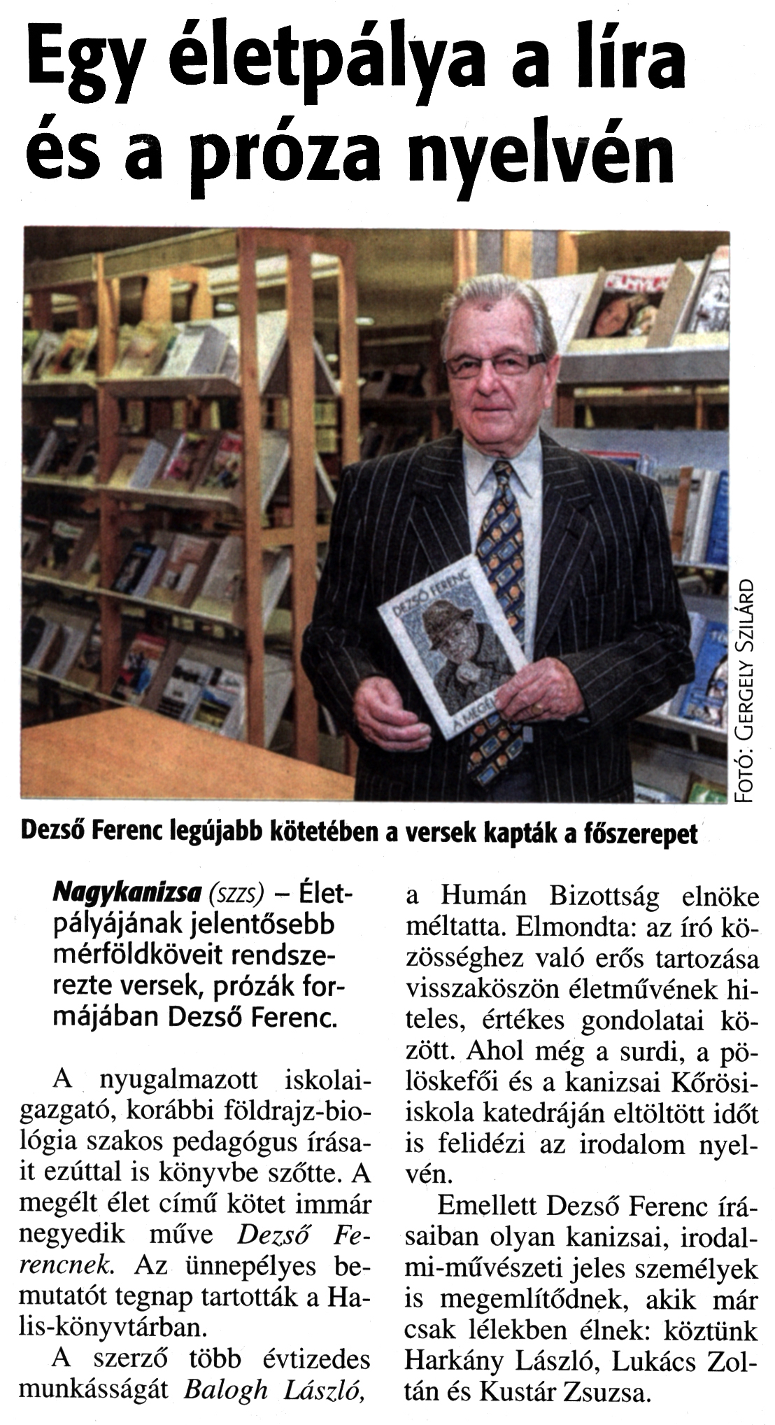 Nyilvános 1868 | 3735 | Zalai Hírlap 2016. november 9. 263. szám 3. oldal | Egy életpálya a líra és a próza nyelvén Dezső Ferenc legújabb kötetében a versek kapták a főszerepet Nagykanizsa (szzs) - Életpályájának jelentősebb mérföldköveit rendszerezte versek, prózák formájában Dezső Ferenc. A nyugalmazott iskolaigazgató, korábbi földrajz-biológia szakos pedagógus írásait ezúttal is könyvbe szőtte. A megélt élet című kötet immár negyedik műve Dezső Ferencnek. Az ünnepélyes bemutatót tegnap tartották a Halis-könyvtárban. A szerző több évtizedes munkásságát Balogh László, a Humán Bizottság elnöke méltatta. Elmondta: az író közösséghez való erős tartozása visszaköszön életművének hiteles, értékes gondolatai között. Ahol még a surdi, a pölöskefői és a kanizsai Kőrösi-iskola katedráján eltöltött időt is felidézi az irodalom nyelvén. Emellett Dezső Ferenc írásaiban olyan kanizsai, irodalmi-művészeti jeles személyek is megemlítődnek, akik már csak lélekben élnek: köztünk Harkány László, Lukács Zoltán és Kustár Zsuzsa. |