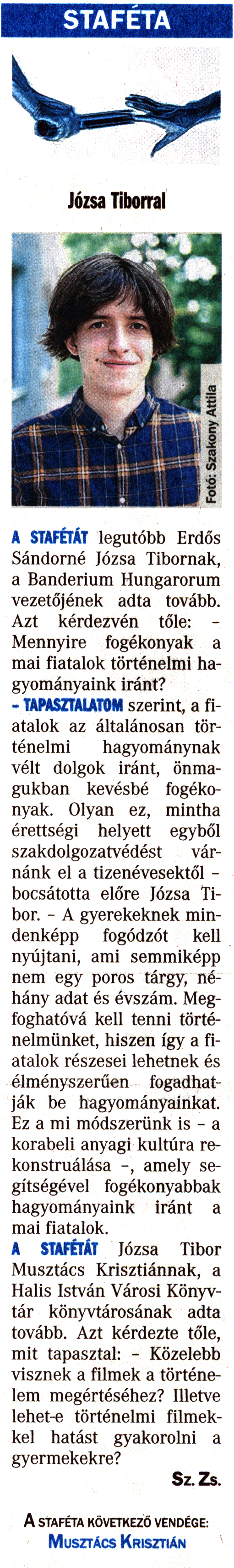 Nyilvános 1868 | 4829 | Rövid leírás | Teljes leírás (1.32 KB) | Vasárnapi Zalai Hírlap 2017. május 20. 20. szám 5. oldal STAFÉTA A STAFÉTÁT legutóbb Erdős Sándorné Józsa Tibornak, a Banderium Hungarorum vezetőjének adta tovább. Azt kérdezvén tőle: - Mennyire fogékonyak a mai fiatalok történelmi hagyományaink iránt? - TAPASZTALATOM szerint, a fiatalok az általánosan történelmi hagyománynak vélt dolgok iránt, önmagukban kevésbé fogékonyak. Olyan ez, mintha érettségi helyett egyből szakdolgozatvédést várnánk el a tizenévesektől -bocsátotta előre Józsa Tibor. - A gyerekeknek mindenképp fogódzót kell nyújtani, ami semmiképp nem egy poros tárgy, néhány adat és évszám. Megfoghatóvá kell tenni történelmünket, hiszen így a fiatalok részesei lehetnek és élményszerűen fogadhatják be hagyományainkat. Ez a mi módszerünk is - a korabeli anyagi kultúra rekonstruálása -, amely segítségével fogékonyabbak hagyományaink iránt a mai fiatalok. A STAFÉTÁT Józsa Tibor Musztács Krisztiánnak, a Halis István Városi Könyvtár könyvtárosának adta tovább. Azt kérdezte tőle, mit tapasztal: - Közelebb visznek a filmek a történelem megértéséhez? Illetve lehet-e történelmi filmekkel hatást gyakorolni a gyermekekre? Sz. Zs. A STAFÉTA KÖVETKEZŐ VENDÉGE: Musztács Krisztián |