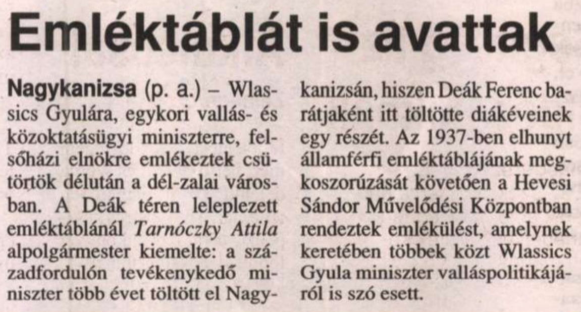 Nyilvános 900 | 1124 | Zalai Hirlap 2002. március 16. 5. oldal | Emléktáblát is avattak Nagykanizsa (p. a.) - Wlassics Gyulára, egykori vallás- és közoktatásügyi miniszterre, felsőházi elnökre emlékeztek csütörtök délután a dél-zalai városban. A Deák téren leleplezett emléktáblánál Tarnóczky Attila alpolgármester kiemelte: a századfordulón tevékenykedő miniszter több évet töltött el Nagykanizsán, hiszen Deák Ferenc barátjaként itt töltötte diákéveinek egy részét. Az 1937-ben elhunyt államférfi emléktáblájának megkoszorúzását követően a Hevesi Sándor Művelődési Központban rendeztek emlékülést, amelynek keretében többek közt Wlassics Gyula miniszter valláspolitikájáról is szó esett. |