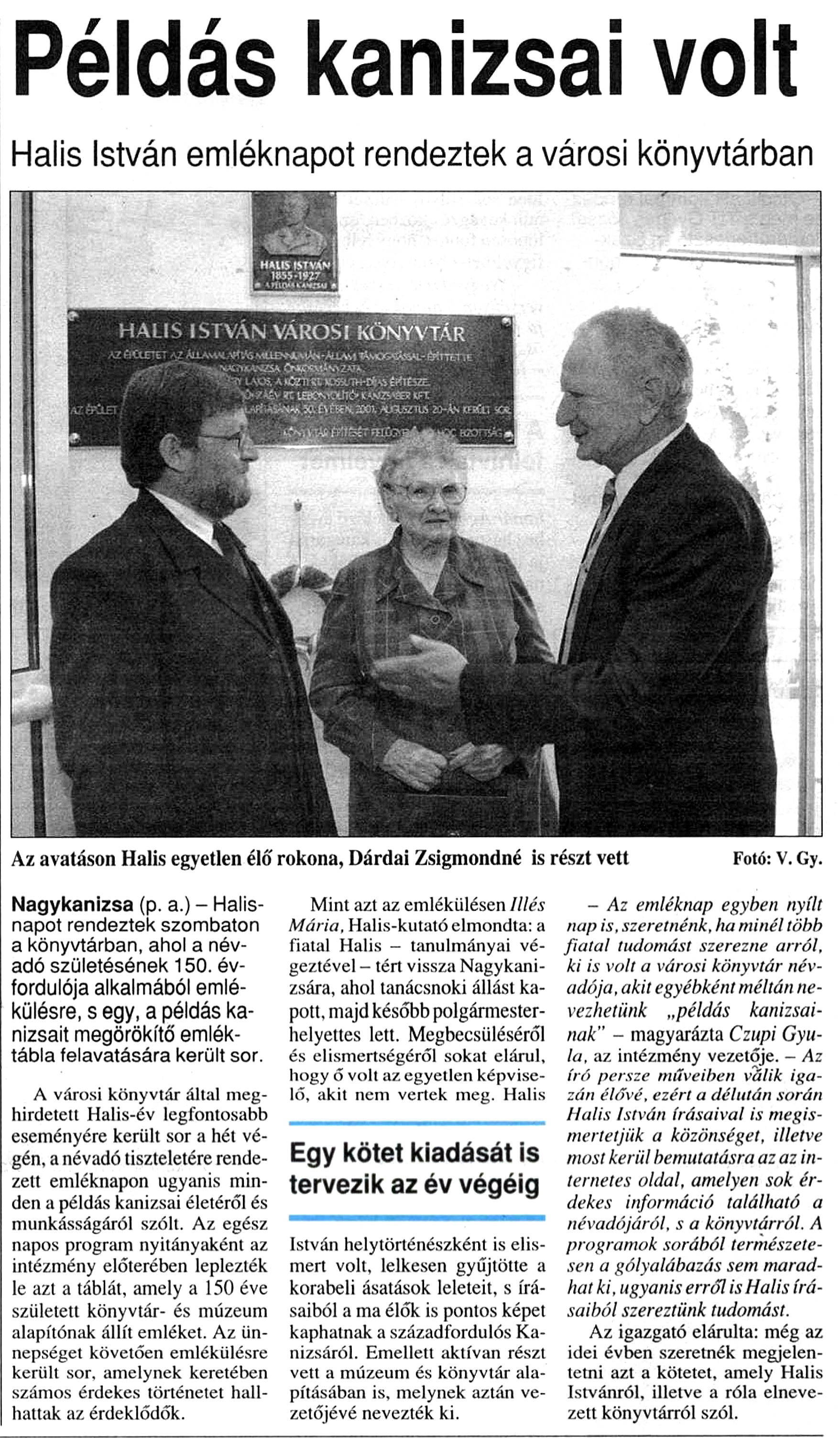 Nyilvános 581 | 876 | Zalai Hírlap 2005. szeptember 26. 5. oldal | Példás kanizsai volt Halis István emléknapot rendeztek a városi könyvtárban Az avatáson Halis egyetlen élő rokona, Dárdai Zsigmondné is részt vett Fotó: V. Gy. Nagykanizsa (p. a.) - Halis-napot rendeztek szombaton a könyvtárban, ahol a névadó születésének 150. évfordulója alkalmából emlékülésre, s egy, a példás kanizsait megörökítő emléktábla felavatására került sor. A városi könyvtár által meghirdetett Halis-év legfontosabb eseményére került sor a hét végén, a névadó tiszteletére rendezett emléknapon ugyanis minden a példás kanizsai életéről és munkásságáról szólt. Az egész napos program nyitányaként az intézmény előterében leplezték le azt a táblát, amely a 150 éve születeti könyvtár- és múzeum alapítónak állít emléket. Az ünnepséget követően emlékülésre került sor, amelynek keretében számos érdekes történetet hallhattak az érdeklődők. Mint azt az emlékülésen Illés Mária. Halis-kutató elmondta: a fiatal Halis - tanulmányai végeztével - tért vissza Nagykanizsára, ahol tanácsnoki állást kapott, majd később polgármester-helyettes lett. Megbecsüléséről és elismertségéről sokat elárul, hogy ő volt az egyetlen képviselő, akit nem vertek meg. Halis István helytörténészként is elismert volt, lelkesen gyűjtötte a korabeli ásatások leleteit, s írásaiból a ma élők is pontos képet kaphatnak a századfordulós Kanizsáról. Emellett aktívan részt vett a múzeum és könyvtár alapításában is, melynek aztán vezetőjévé nevezték ki. - Az emléknap egyben nyílt nap is, szeretnénk, ha minél több fiatal tudomást szerezne arról, ki is volt a városi könyvtár névadója, akit egyébként méltán nevezhetünk „példás kanizsainak" - magyarázta Czupi Gyula, az intézmény vezetője. - Az író persze műveiben válik igazán élővé, ezért a délután során Halis István írásaival is megismertetjük a közönséget, illetve most kerül bemutatásra az az internetes oldal, amelyen sok érdekes információ található a névadójáról, s a könyvtárról. A programok sorából természetesen a gólyalábazás sem maradhat ki, ugyanis erről is Halis írásaiból szereztünk tudomást. Az igazgató elárulta: még az idei évben szeretnék megjelentetni azt a kötetei, amely Halis Istvánról, illetve a róla elnevezett könyvtárról szól. |